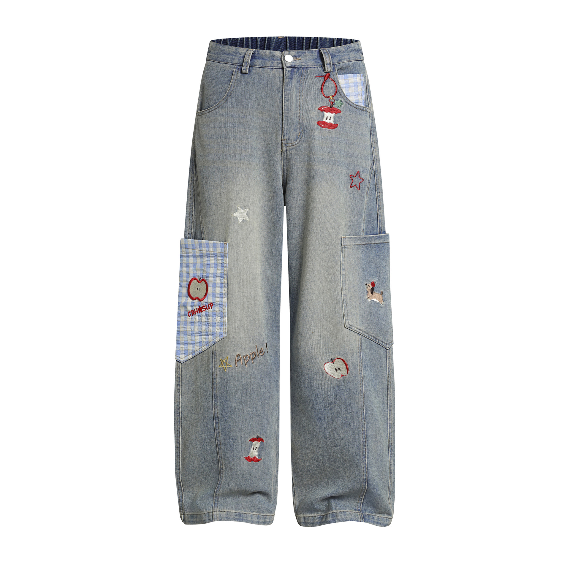 美式复古可爱小狗刺绣拼接牛仔裤男女小众设计感宽松休闲阔腿裤