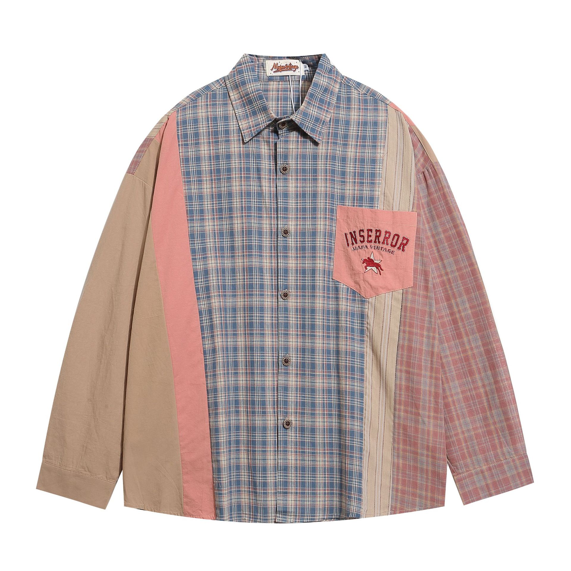 24ssアメリカのレトロな色のストライプは格子のシャツをつなぎ合わせます。