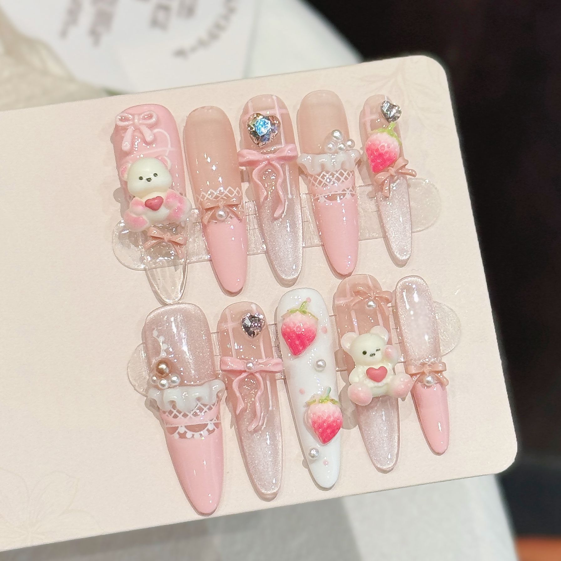 艺禾穿戴甲【草莓小熊】梦幻粉卡通小熊少女心可爱显白长款穿戴甲