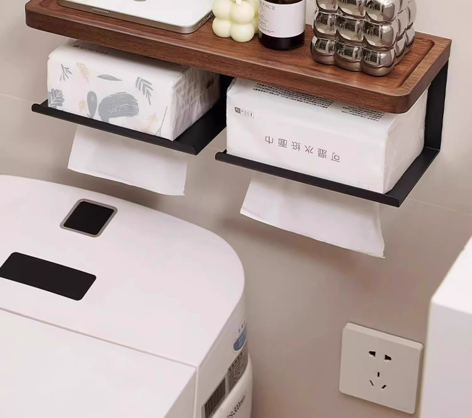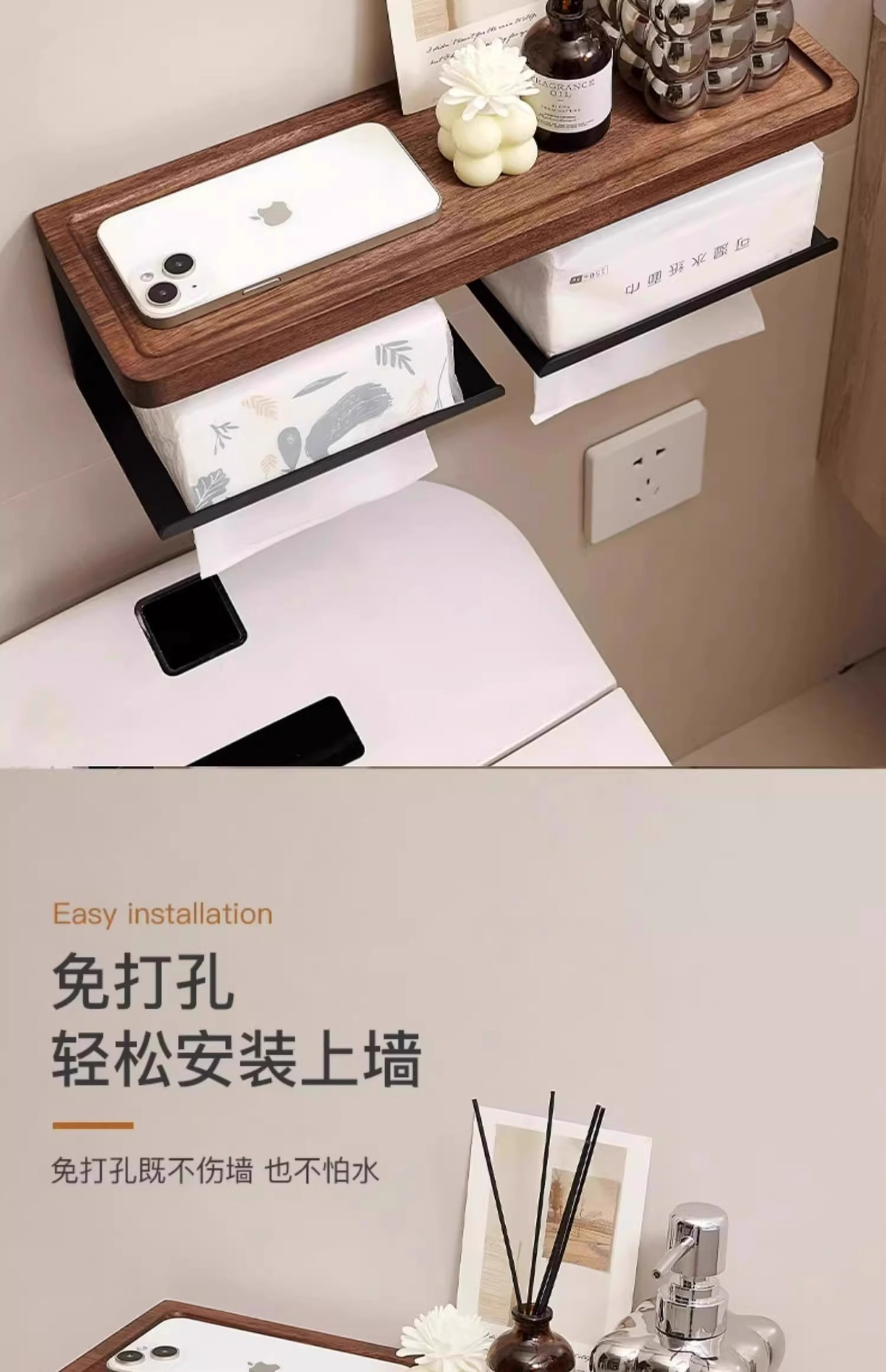 創意的な木のティッシュの棚は穴を開けないでトイレを引き出します。