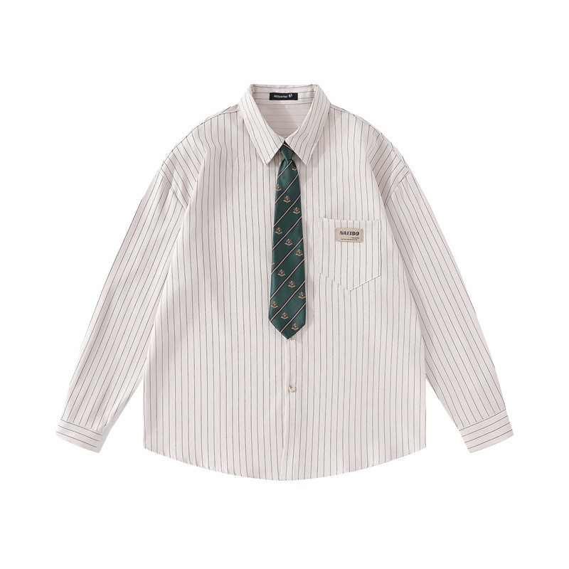 美式复古条纹学院风长袖衬衫男女领带设计感宽松百搭情侣衬衣外套