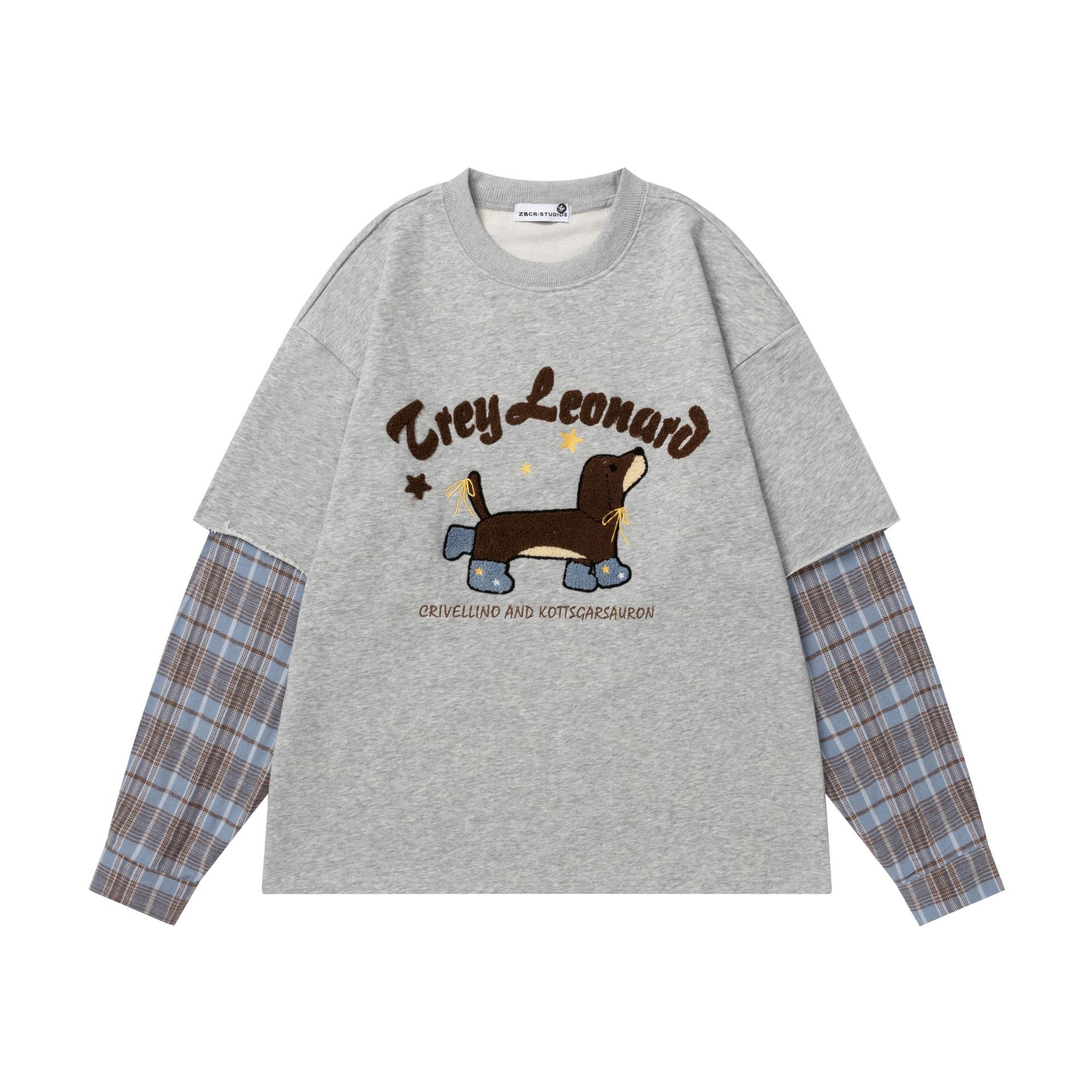 美式复古腊肠小狗刺绣长袖T恤男女秋季宽松休闲假两件设计感上衣