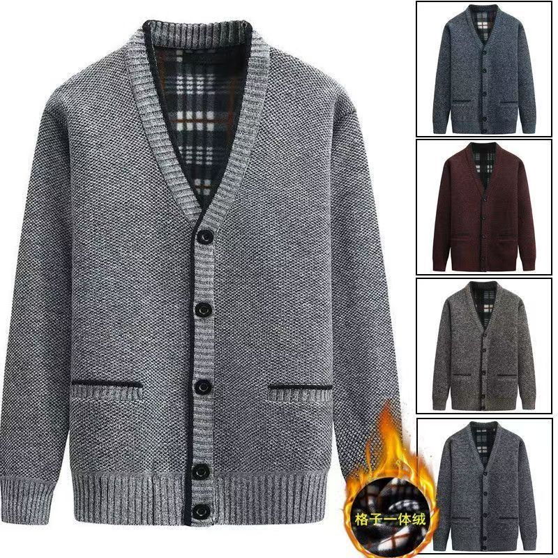 一件代发 冬季中年男加绒毛衣开衫 加厚V领中老年爸爸装针织外套