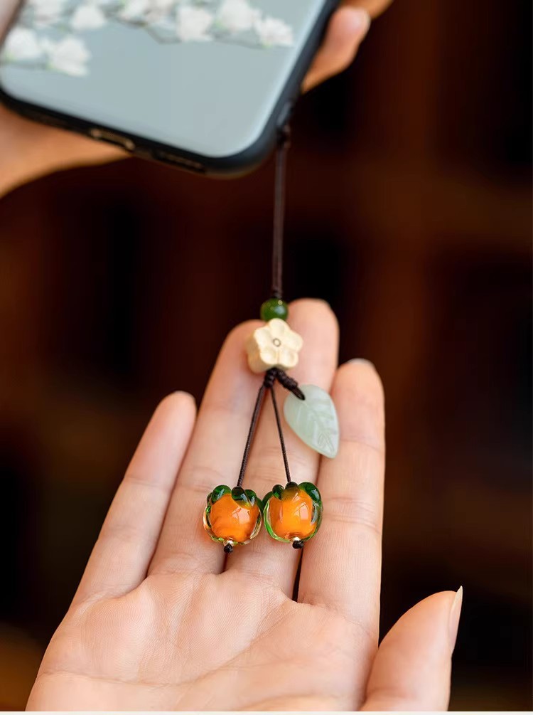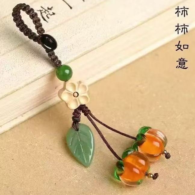 事事如意琉璃柿子手机链挂绳复古中国风柿叶有成车钥匙扣挂件饰品