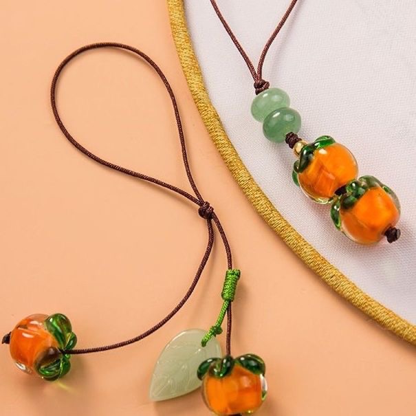 事事如意琉璃柿子手机链挂绳复古中国风柿叶有成钥匙挂件吊坠饰品