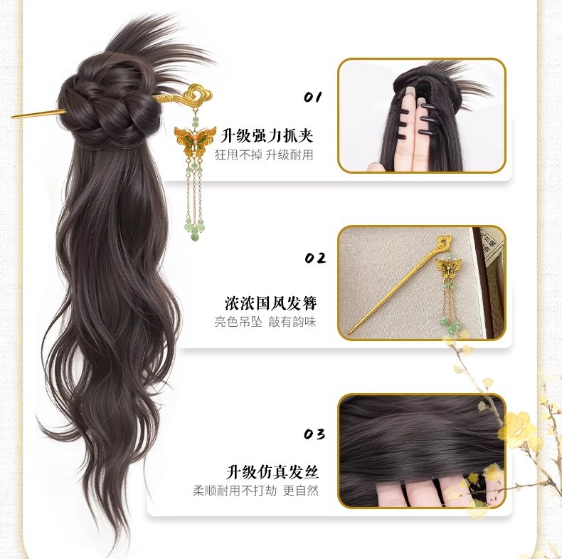 女性用の新しい中国風のウィッグクリップ、ロングヘアのサイドタイ、模擬ポニーテール、漢服チャイナドレス、クールなウィッグポニーテール