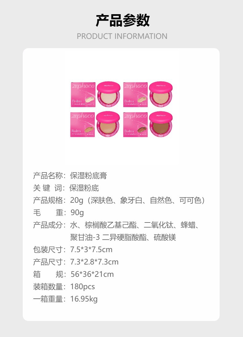 跨境 ZEPHOCO粉底膏 轻薄服帖保湿滋润肌肤遮瑕持久自然不脱妆20g