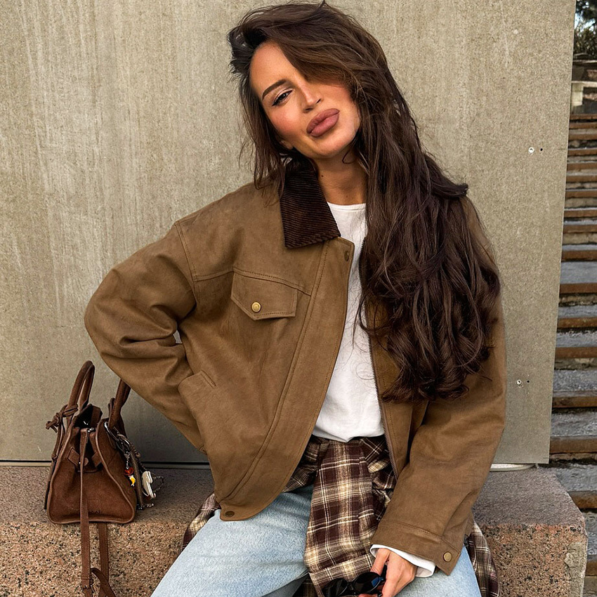 リアルショット-2025春の新作ヨーロッパとアメリカンスタイルのソリッドカラーのファッショナブルで多用途なスエードテクスチャーボンバージャケット
