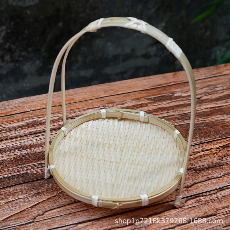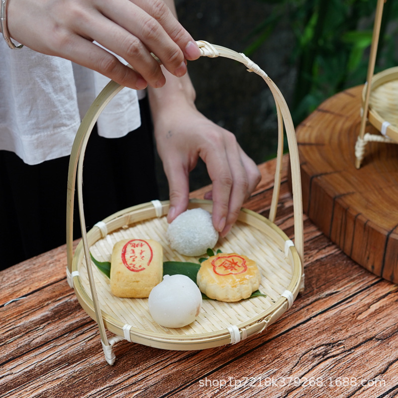 竹编簸箕竹篮子点心托果盘圆形提手多层小竹篮果篮带木架子小道具