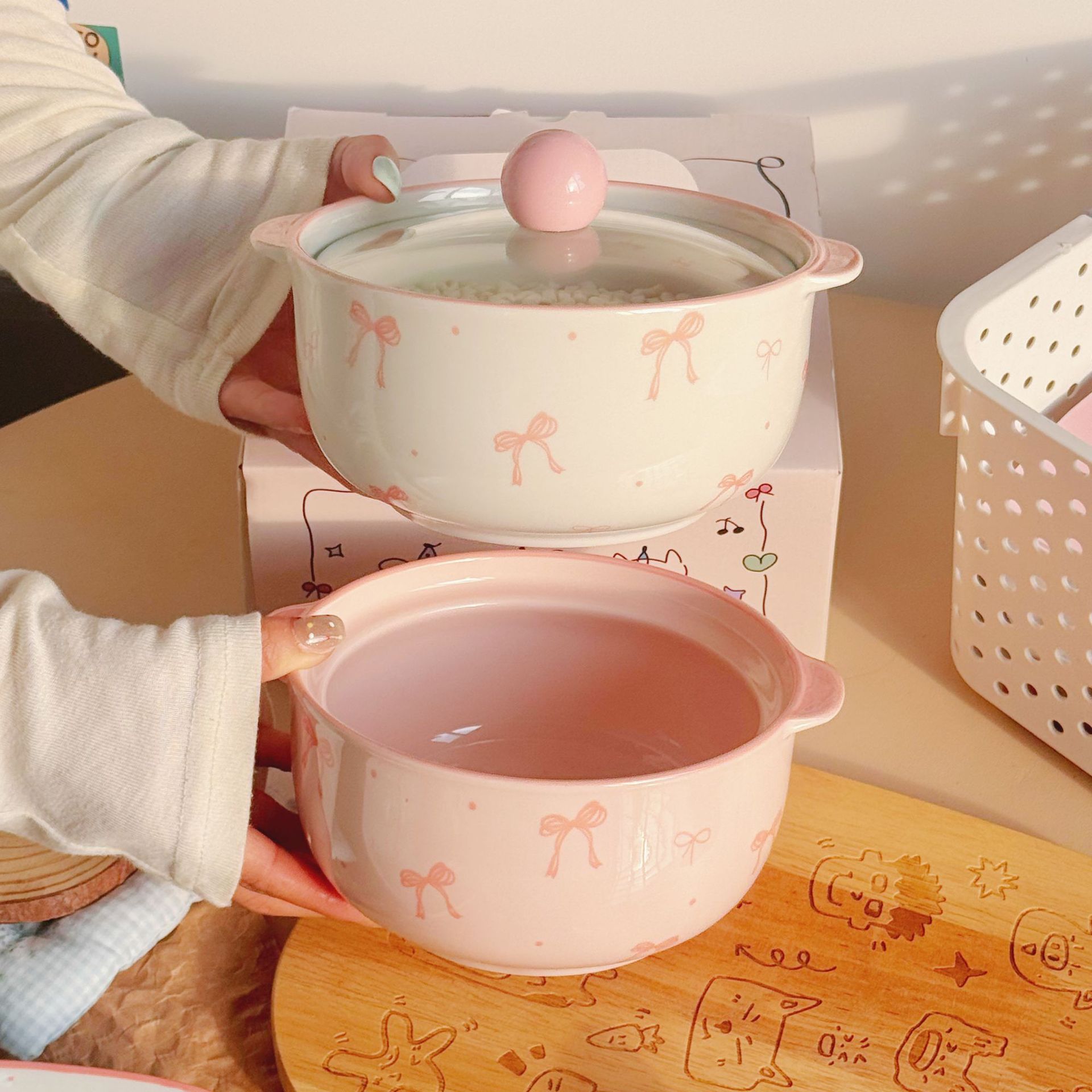超仙新款泡面碗蝴蝶结高颜值陶瓷面碗耐高温高级带盖少女螺狮粉碗