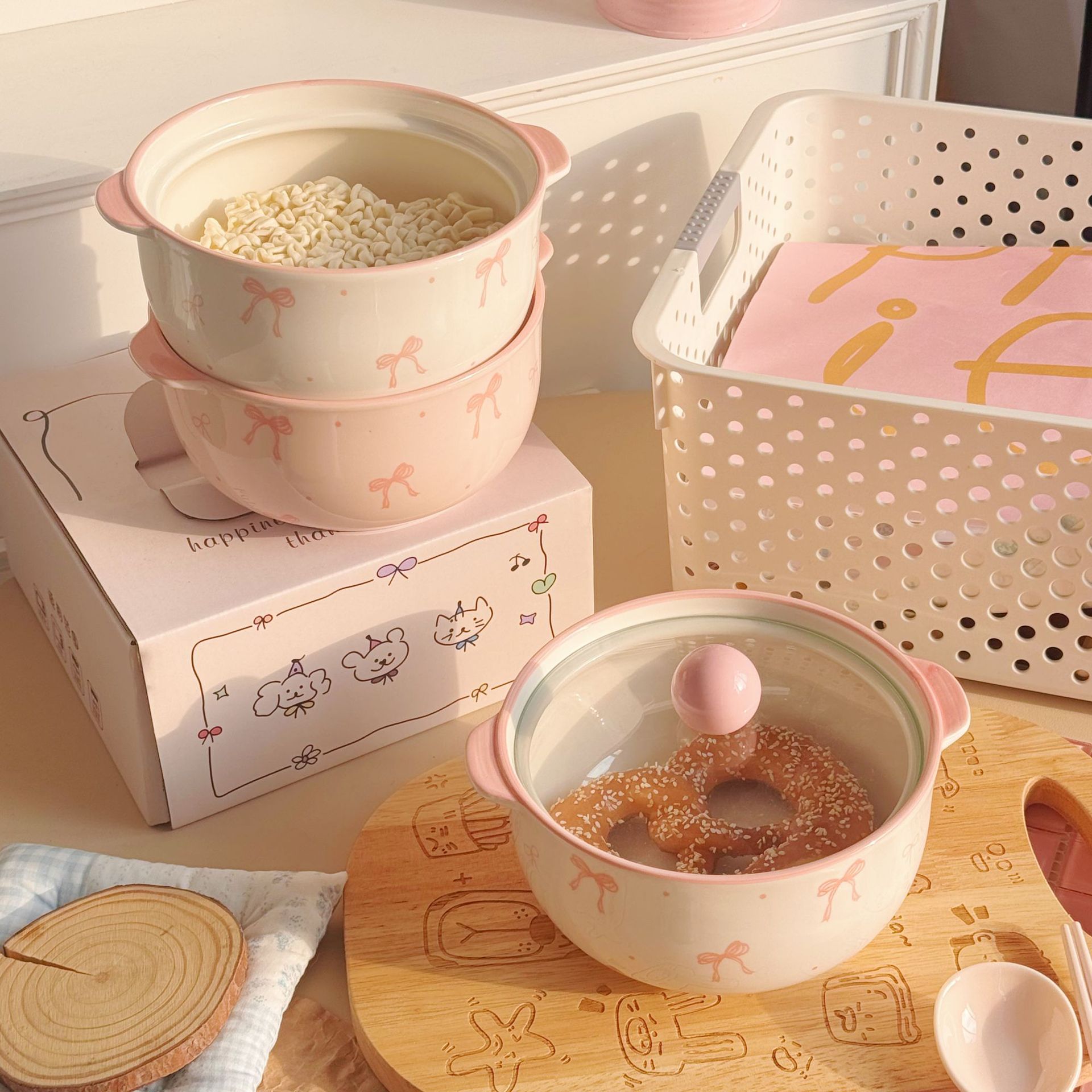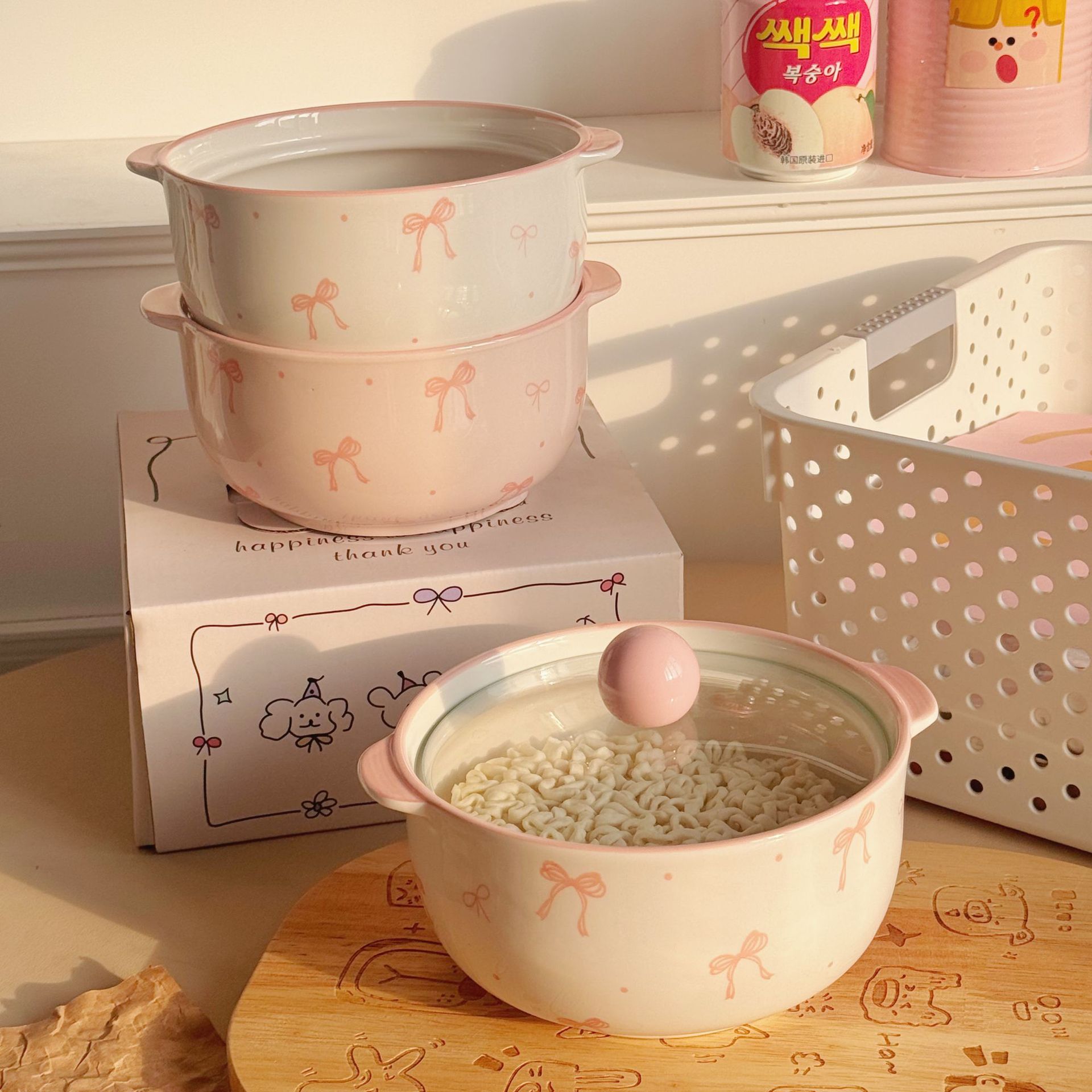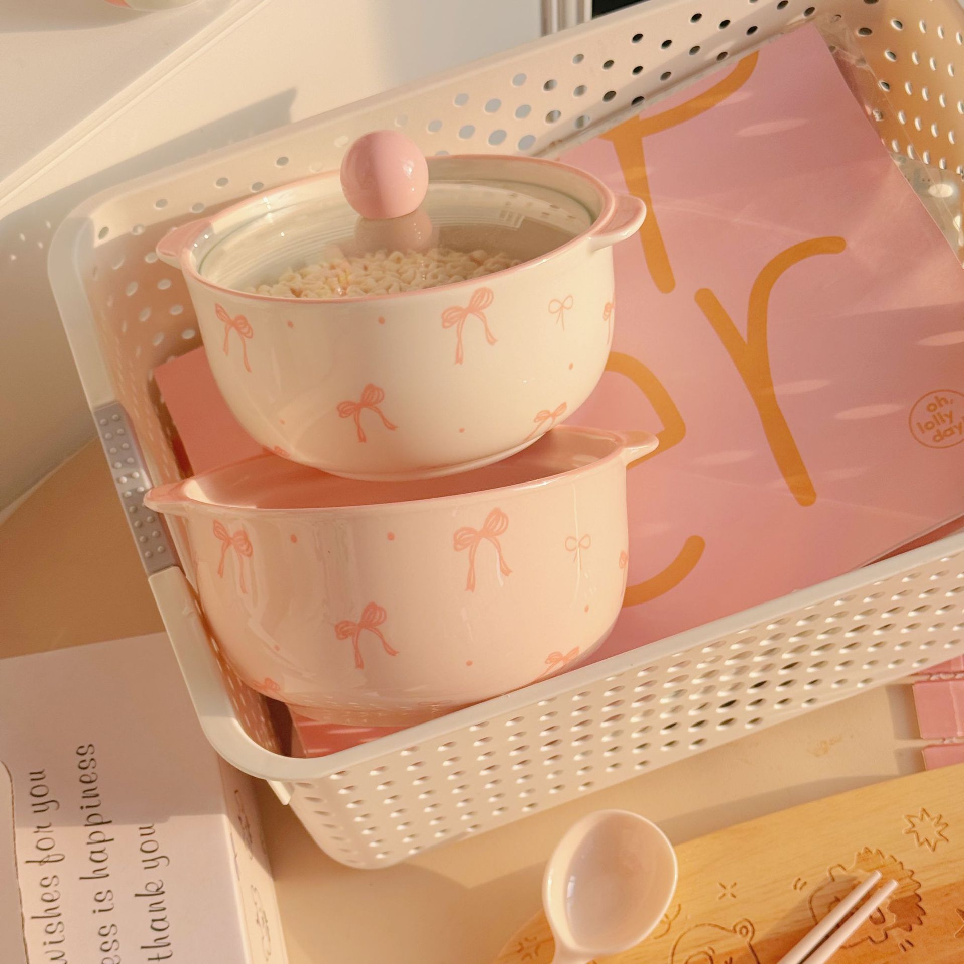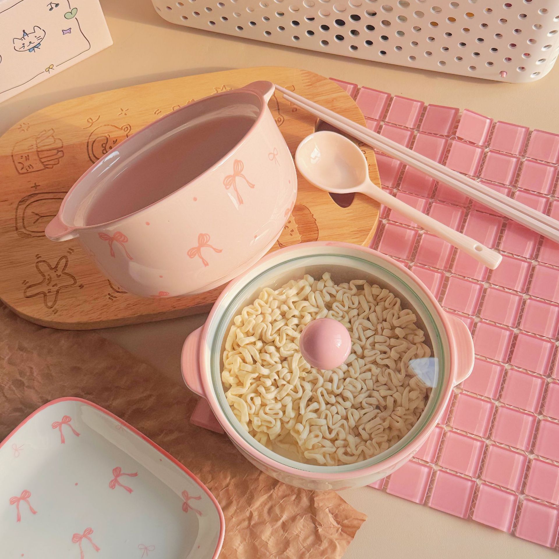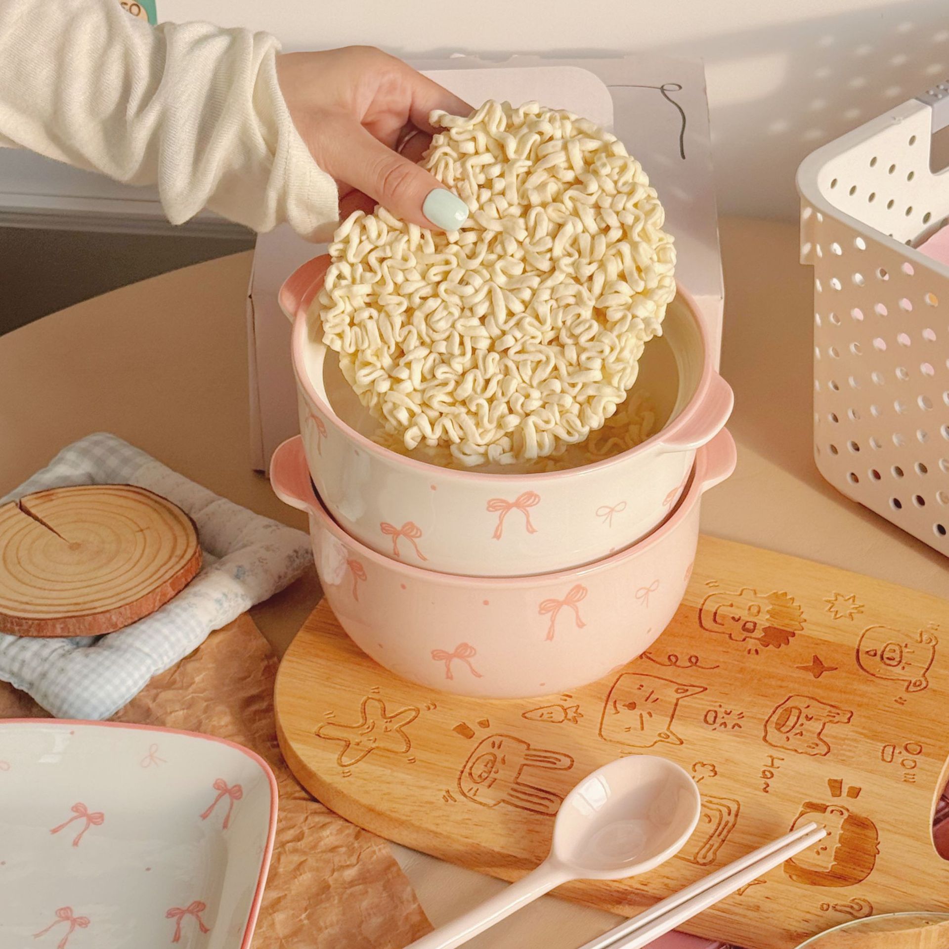 ピンクインスタイルリボンセラミック食器セットヌードルボウル家庭用ライスボウルプレート釉下色が女の子のハートに映えます
