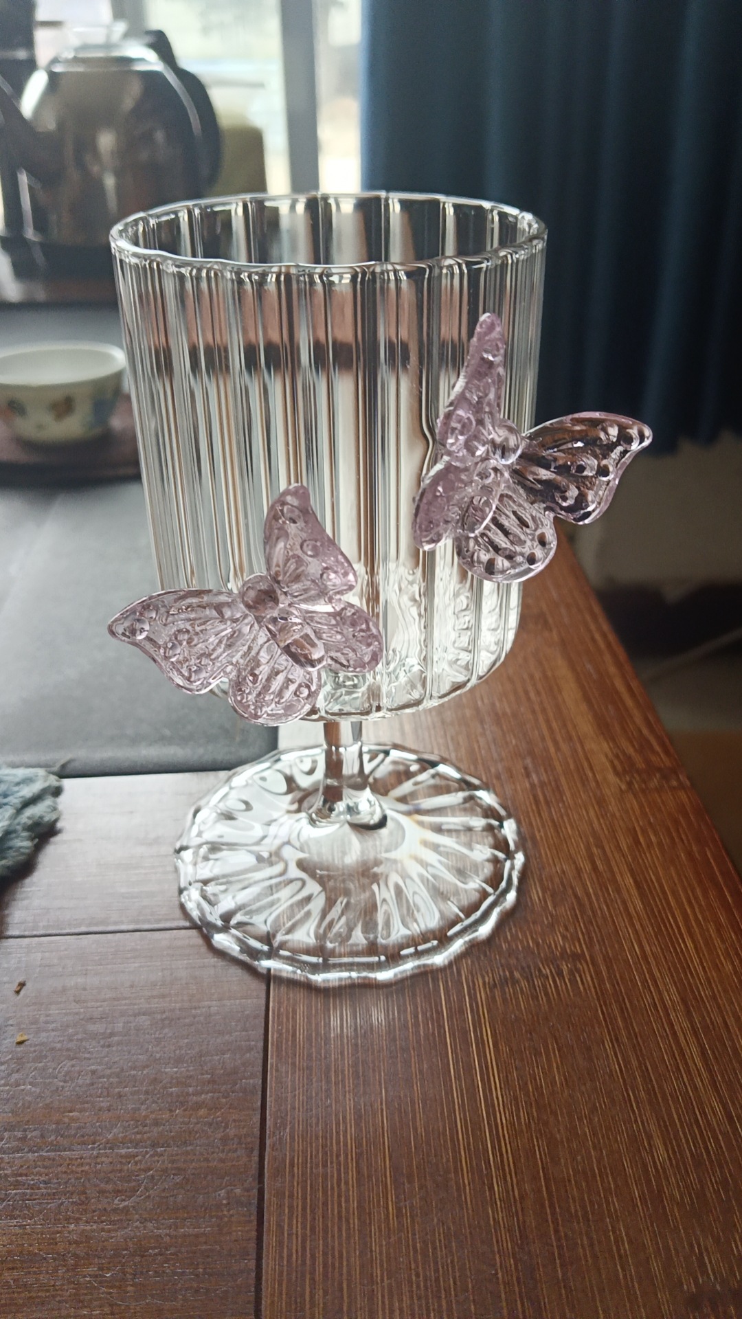 春日蝴蝶高硼硅玻璃高脚杯高颜值客厅餐厅家用加厚竖纹透明玻璃杯