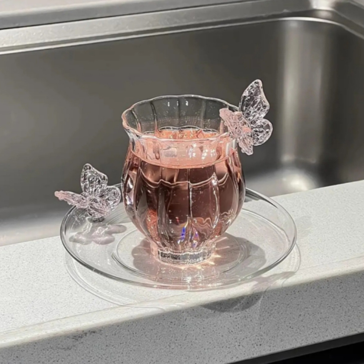 アンドロメダのピンク蝶ストローポット高颜値耐熱ガラスミルクカップ家庭用シングルグラス