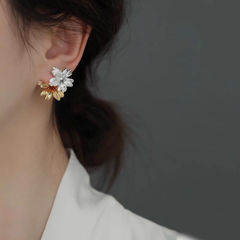 S925銀針シンプル衝突色金属花2つのピアス独特なデザイン感があります。
