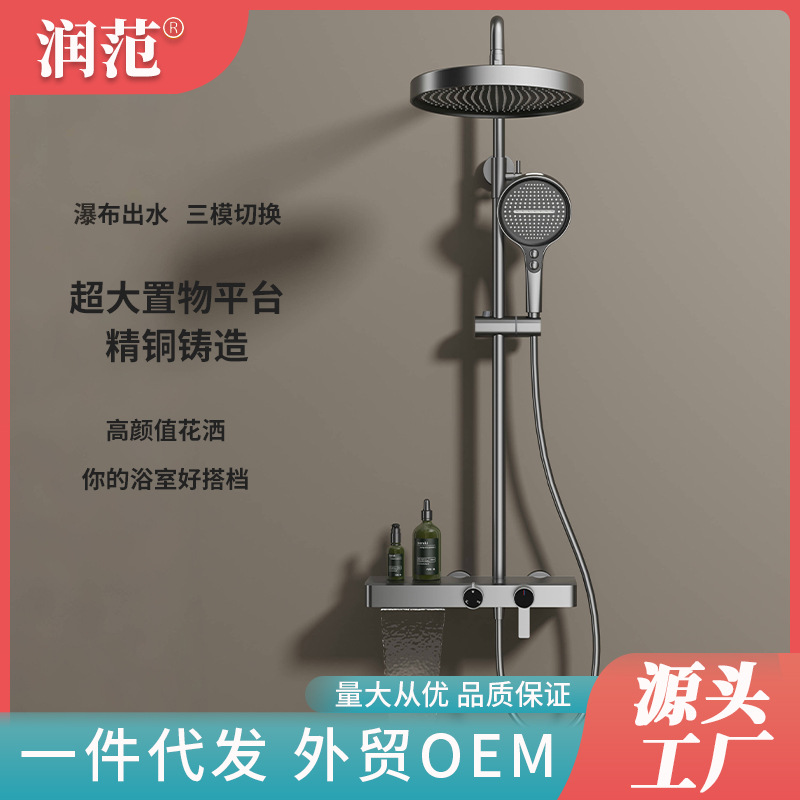 枪灰色新款置物架花洒套装全铜旋钮冷热家用花洒套装瀑布下出水