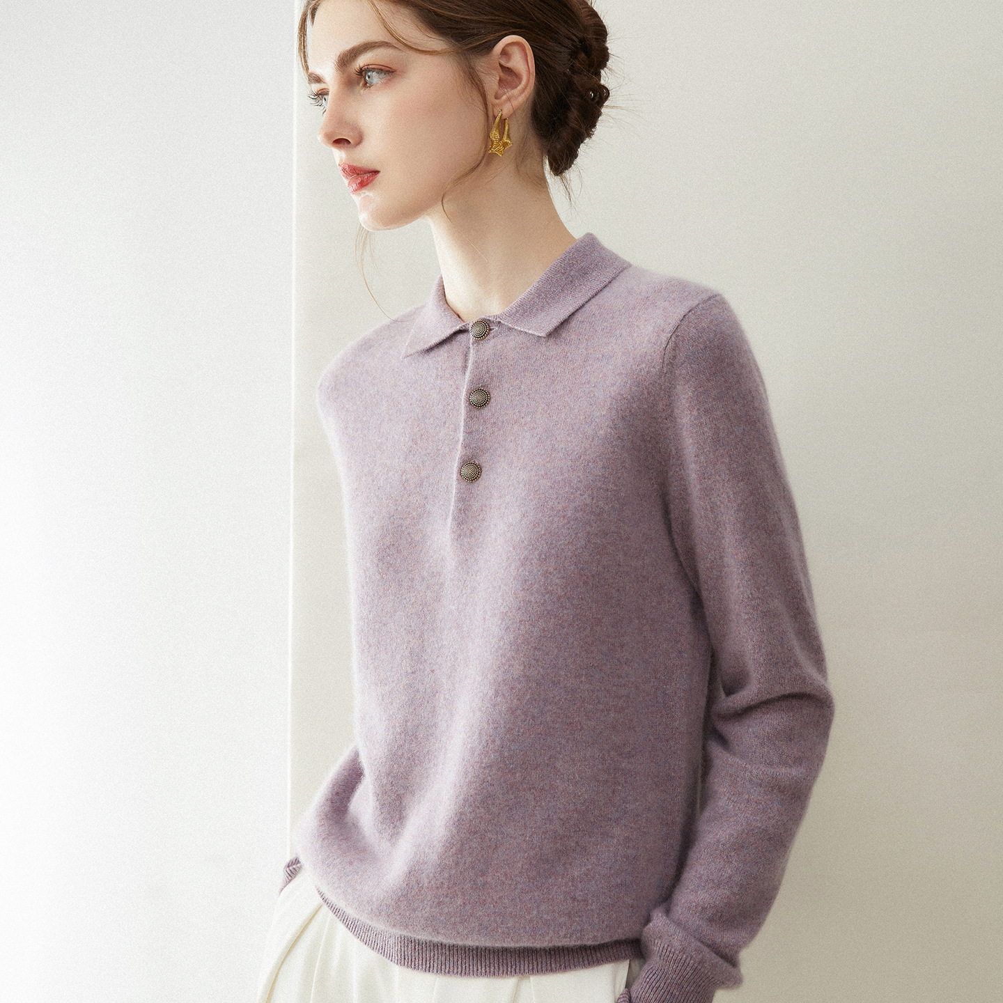 羊绒衫女100%纯山羊绒新款polo领纯色休闲针织套头保暖毛衣