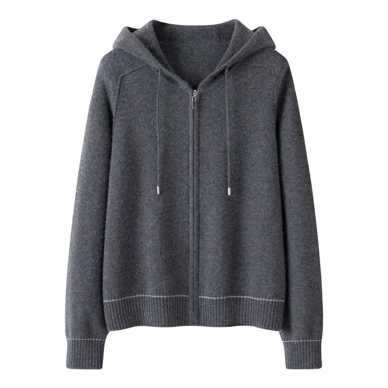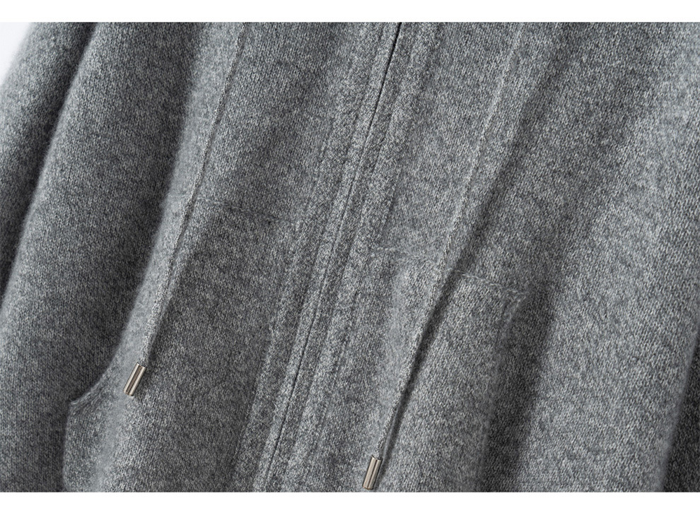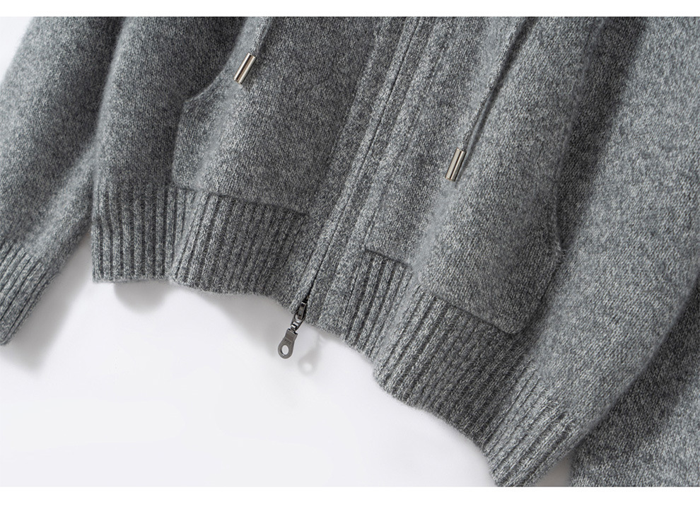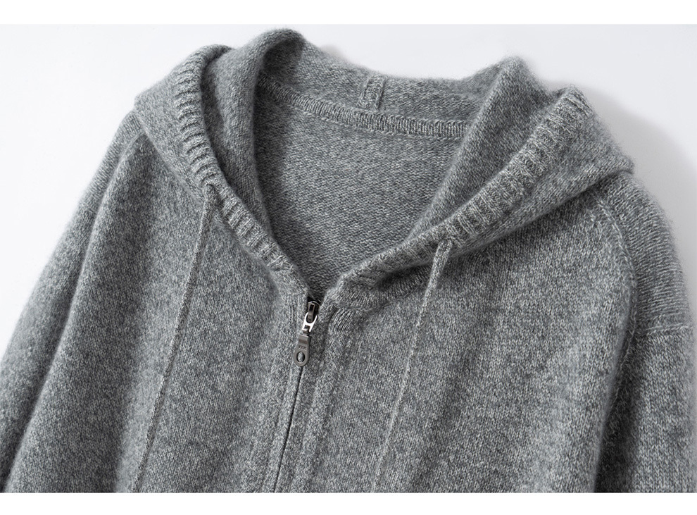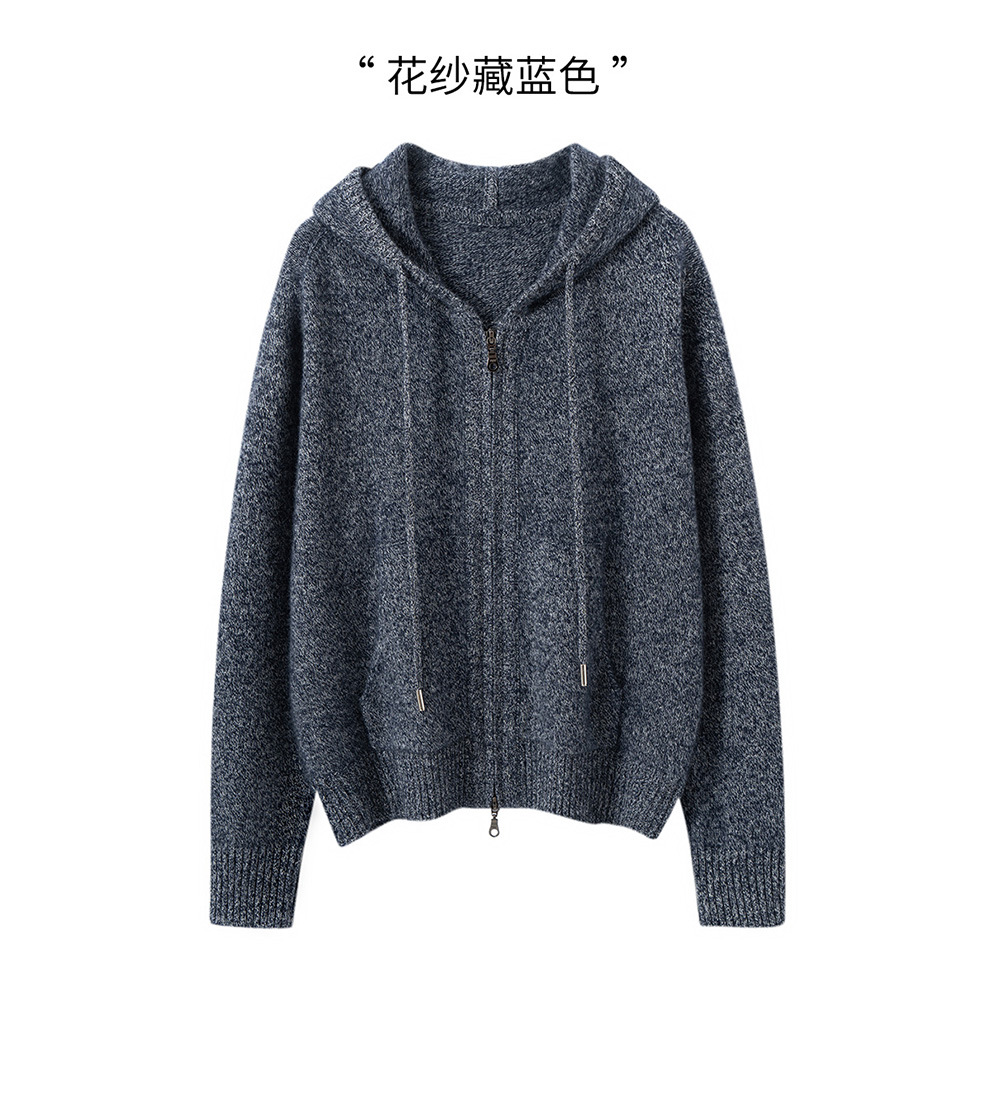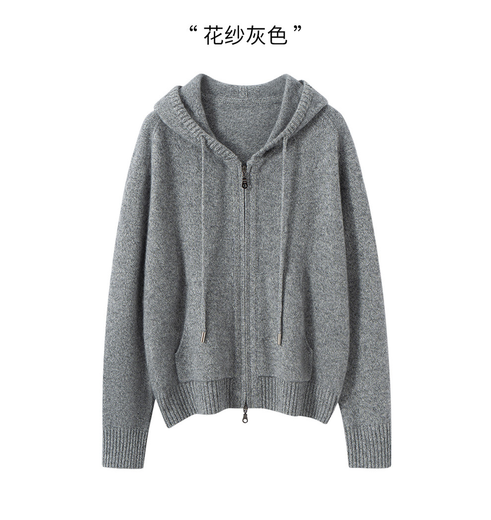 100纯山羊绒针织开衫连帽拉链简约加厚毛衣外套帽衫落肩袖羊绒衫