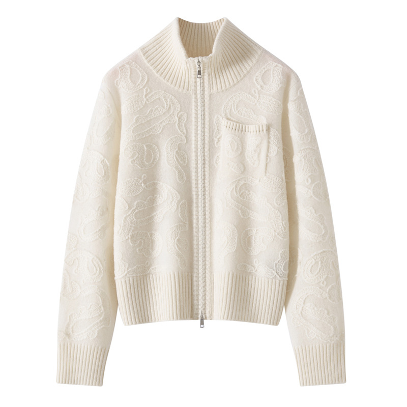 2025年秋冬新款重工刺绣带兜拉链高领针织开衫百搭纯色立领外套女
