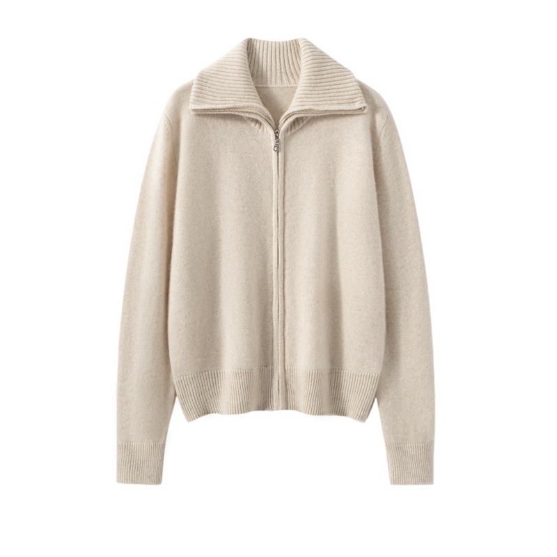 100%纯山羊绒秋冬新款女翻领拉链长袖针织时尚毛衣外套