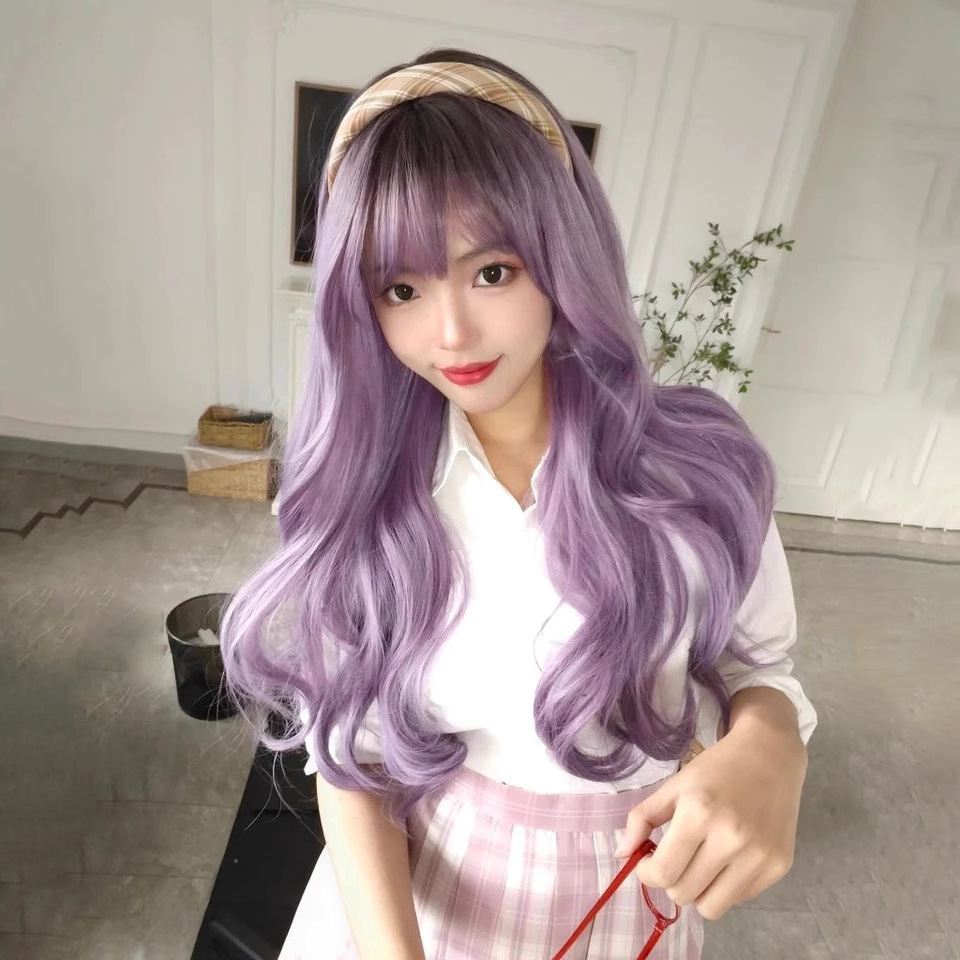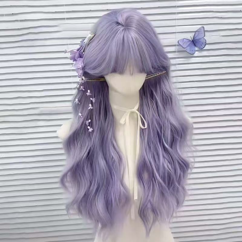 紫色假发女长发芭比风Lolita齐刘海长卷发水波纹羊毛卷自然全头套