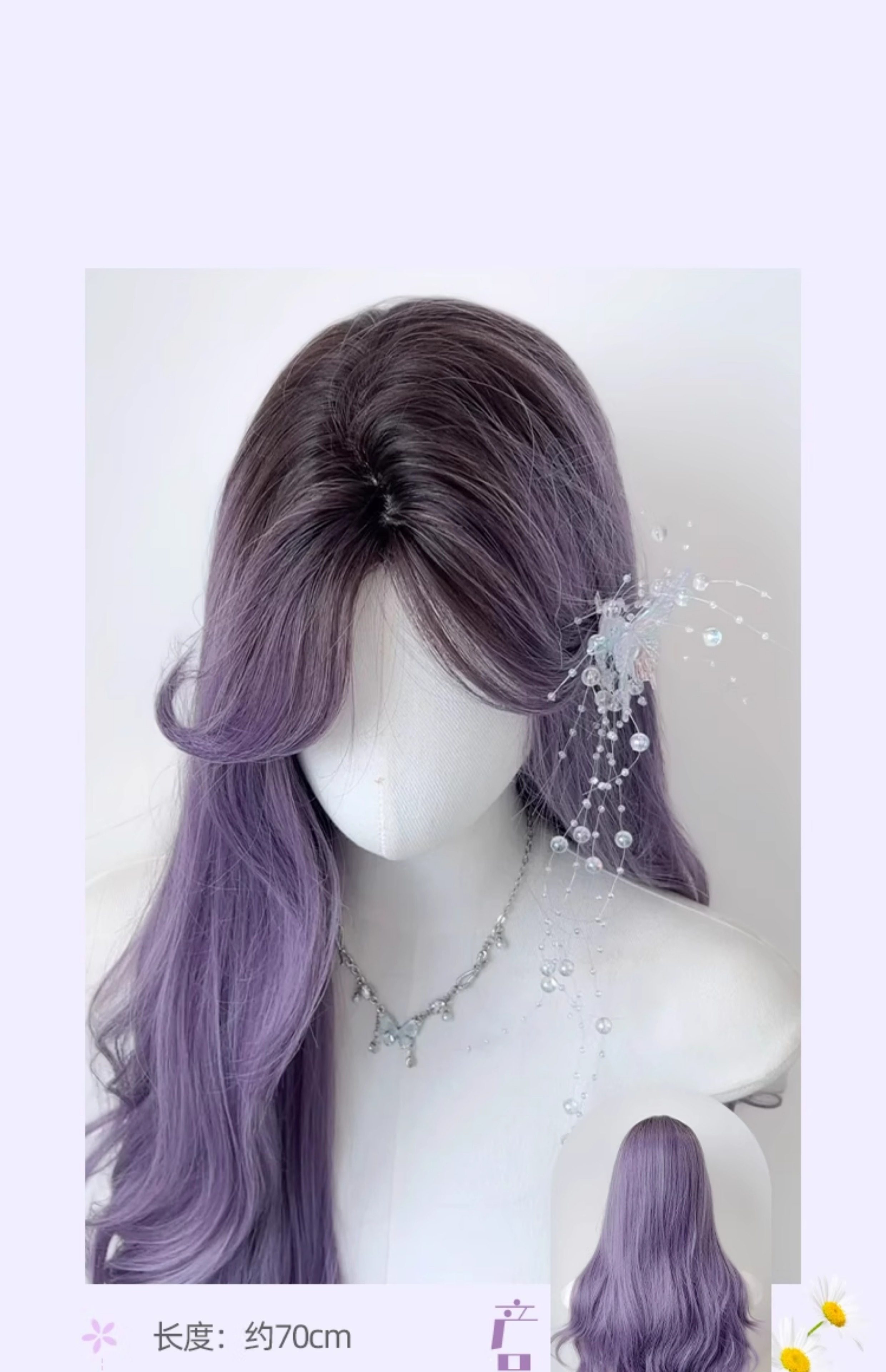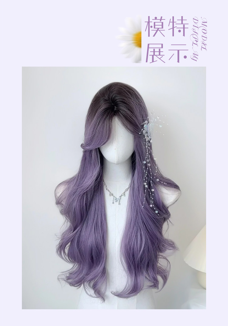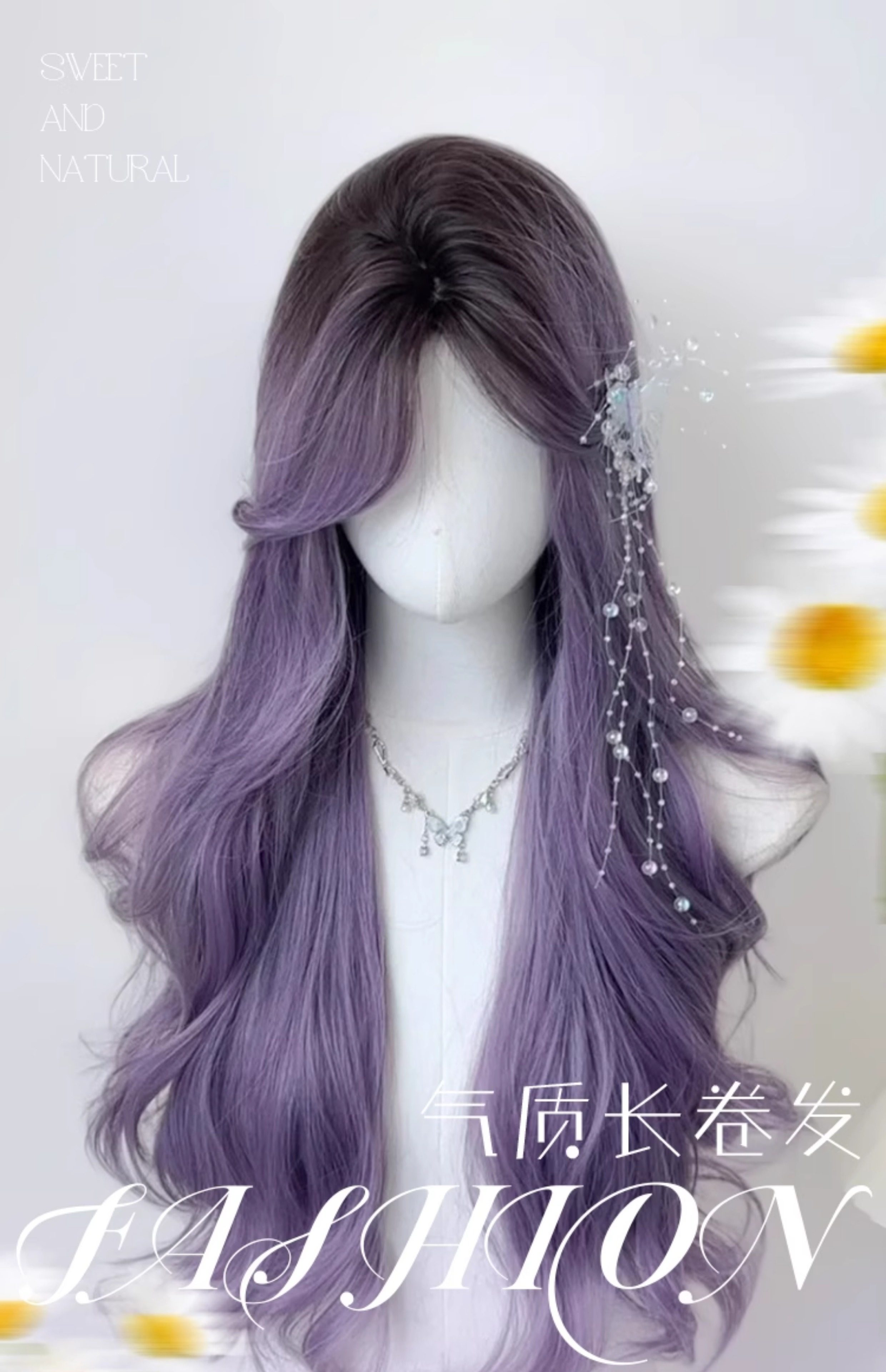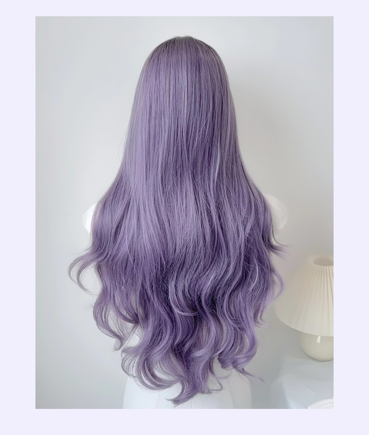 元泱ウィッグ グレーパープルグラデーションウィッグ 女性用ロングヘア ナチュラルな中央分け目 大きなウェーブロングカールヘア フルヘッドタイプウィッグ