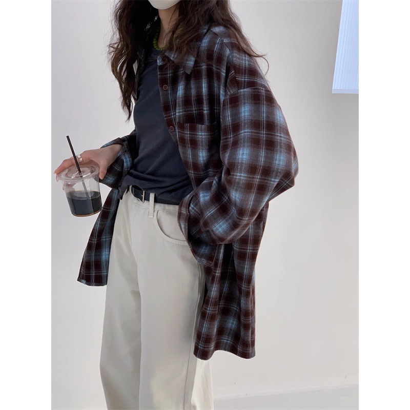 FEITA复古蓝咖磨毛格子衬衫女慵懒休闲显瘦百搭长袖衬衣外套