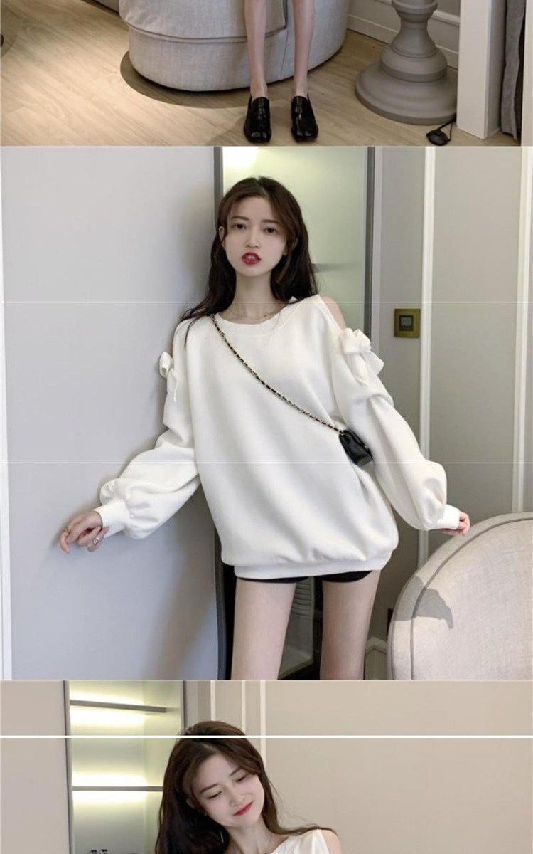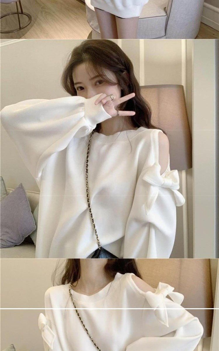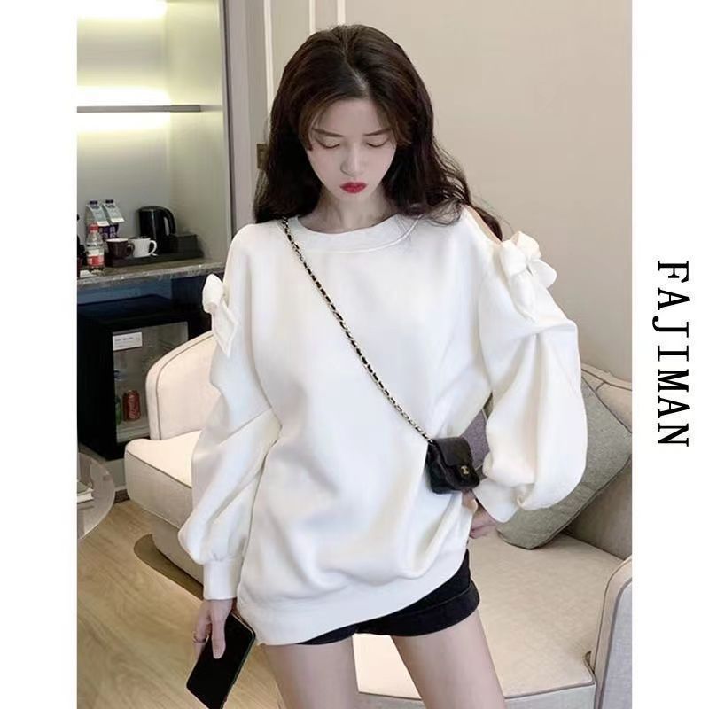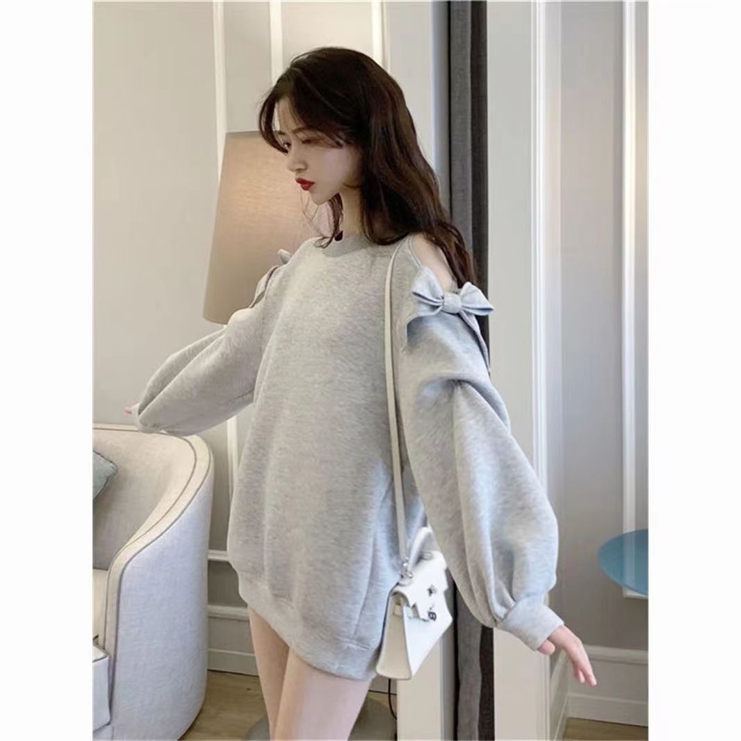 蝴蝶结长袖露肩卫衣女装春秋季薄款大码无帽ins风辣妹中长款上衣
