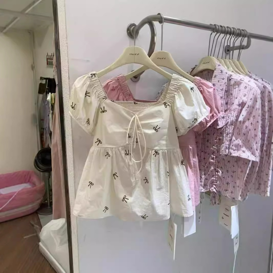 新しいギャルの蝶結びのプリントのシャツの女性服の夏のデザインのひもはやせている短い泡の女性の夏の上着を現します。