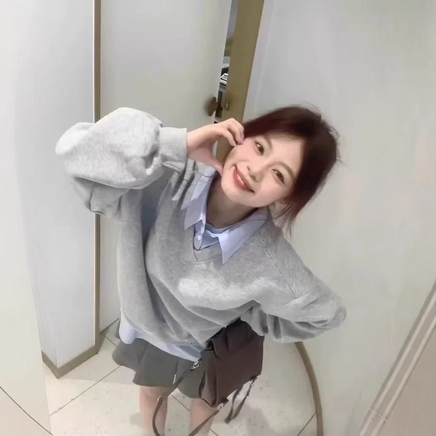 韩系学院风假两件长袖卫衣女春2025新款宽松休闲显瘦内搭上衣春