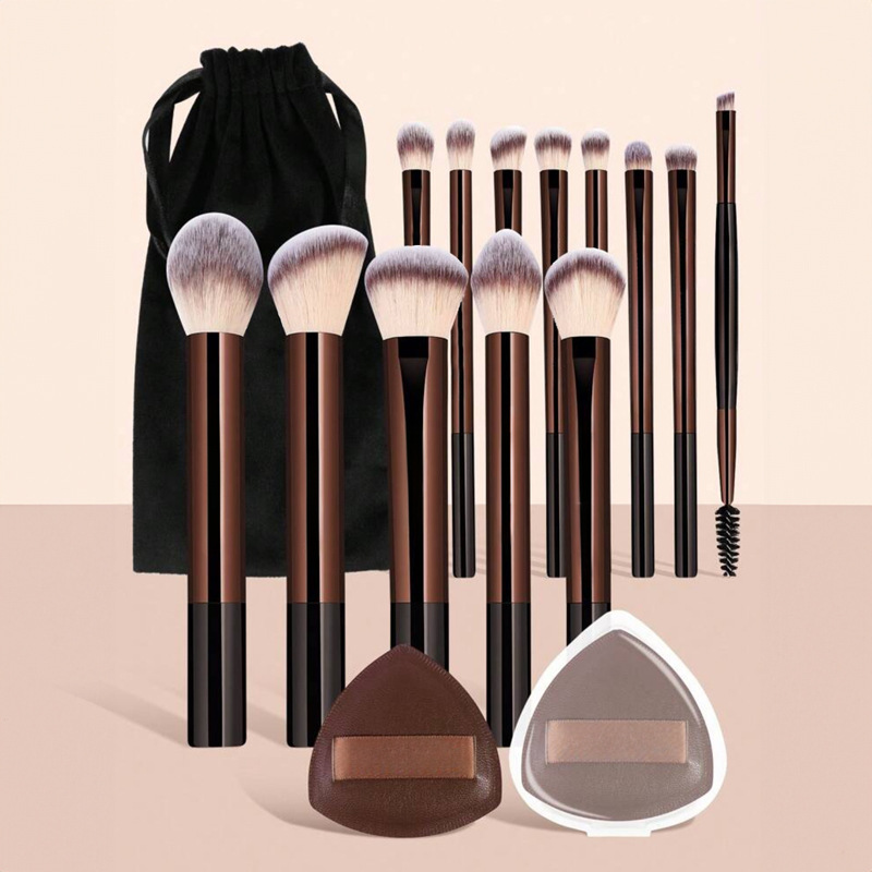 跨境新款13支棕色铝管化妆刷套装+布袋+2个棕三角+盒