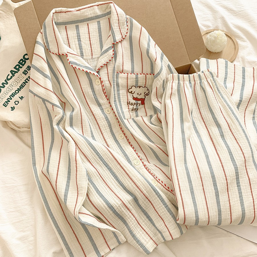 纯棉纱布睡衣女春秋季新款长袖卡通可爱条纹小狗家居服可外穿套装