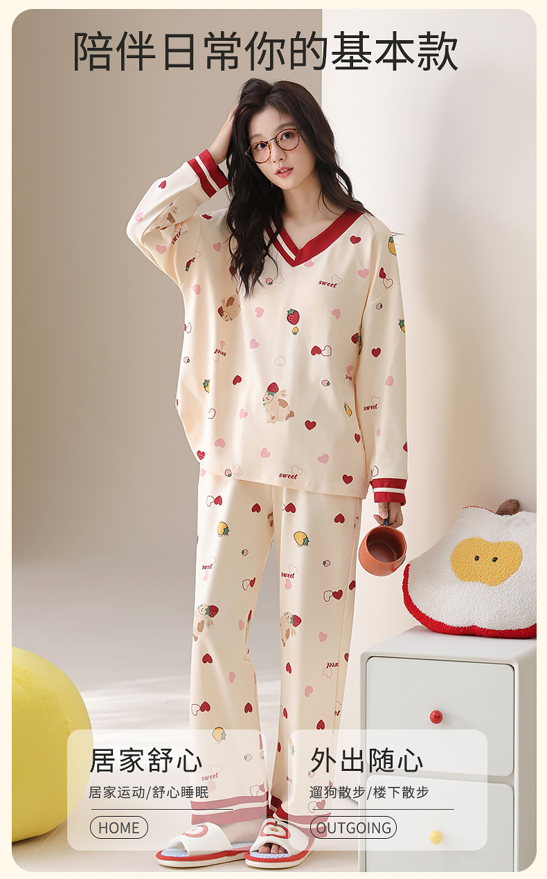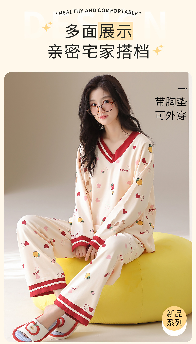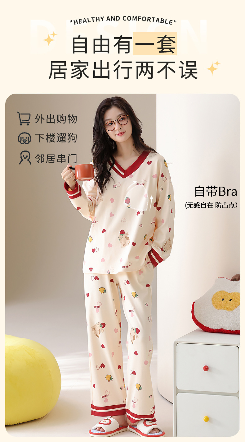 【带胸垫】睡衣女春秋款100%纯棉休闲秋季全棉可爱宽松家居服套装
