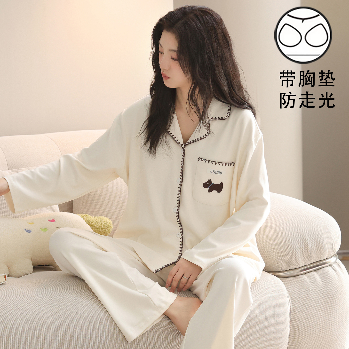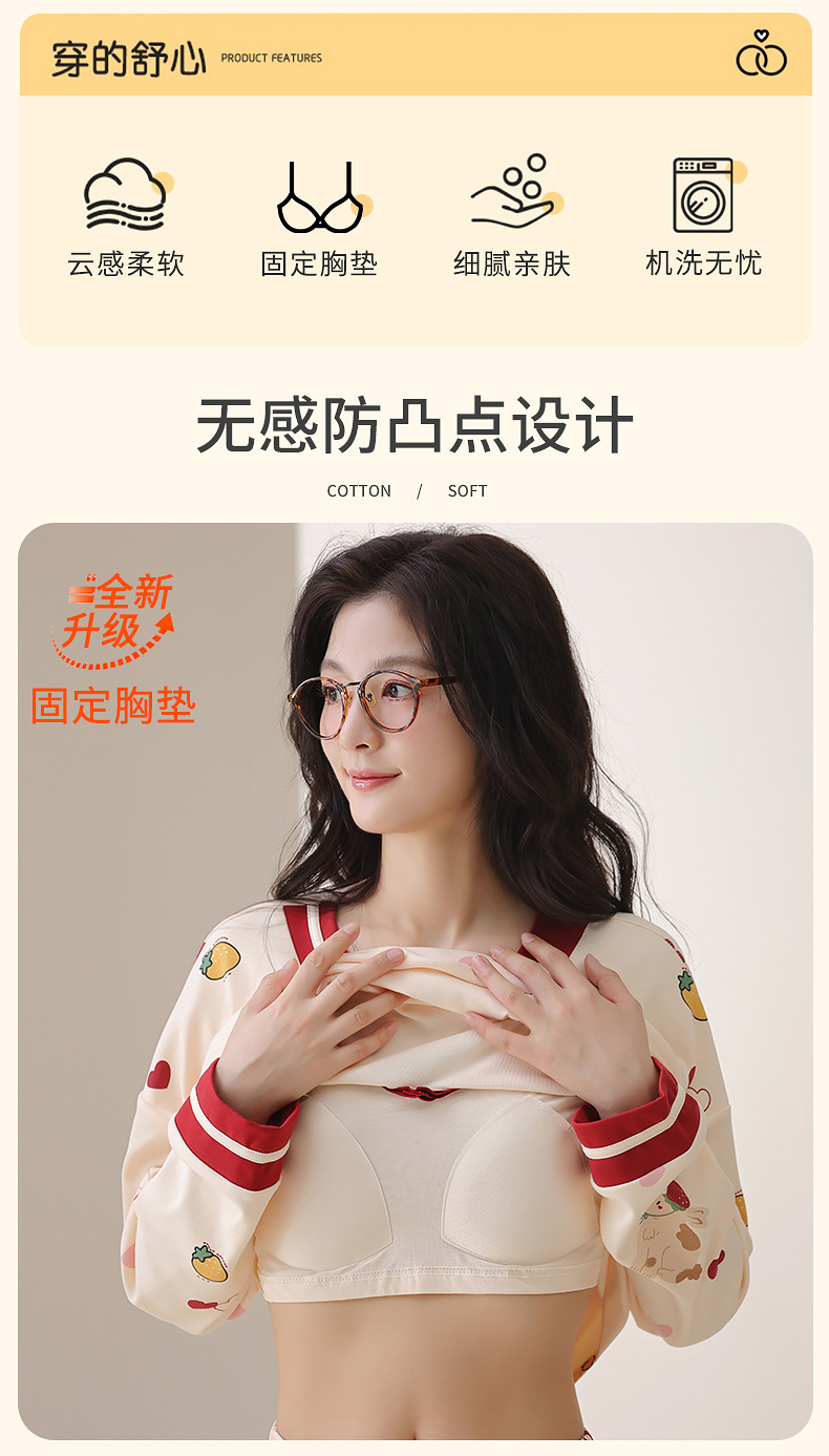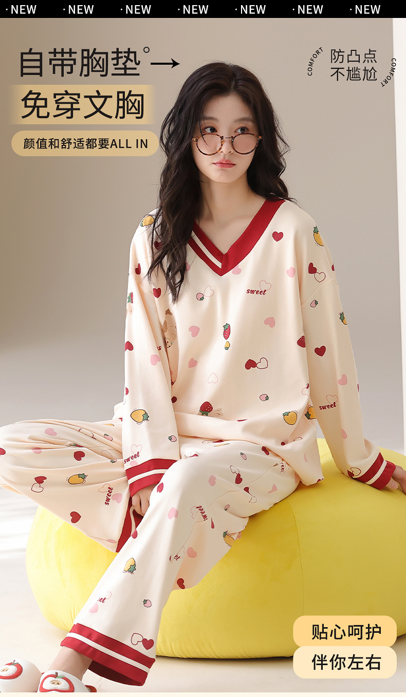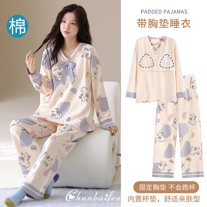 胸パッド付きパジャマ女性純綿長袖春秋タイプは下着を着用しないで、家庭服セットを着ることができます。