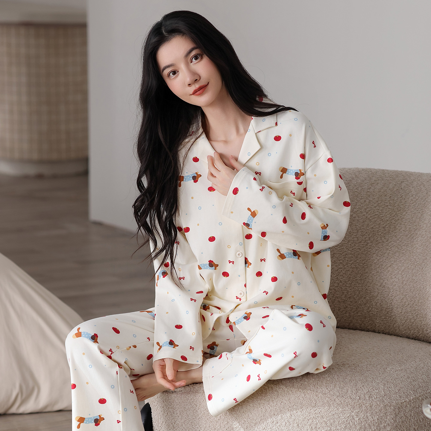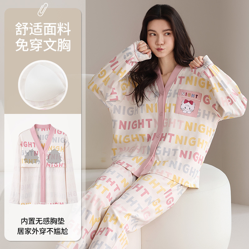 【胸パッド付き】100% 純綿パジャマ女性春と秋の綿100% カーディガン長袖可愛いキャラクタールーム服セット