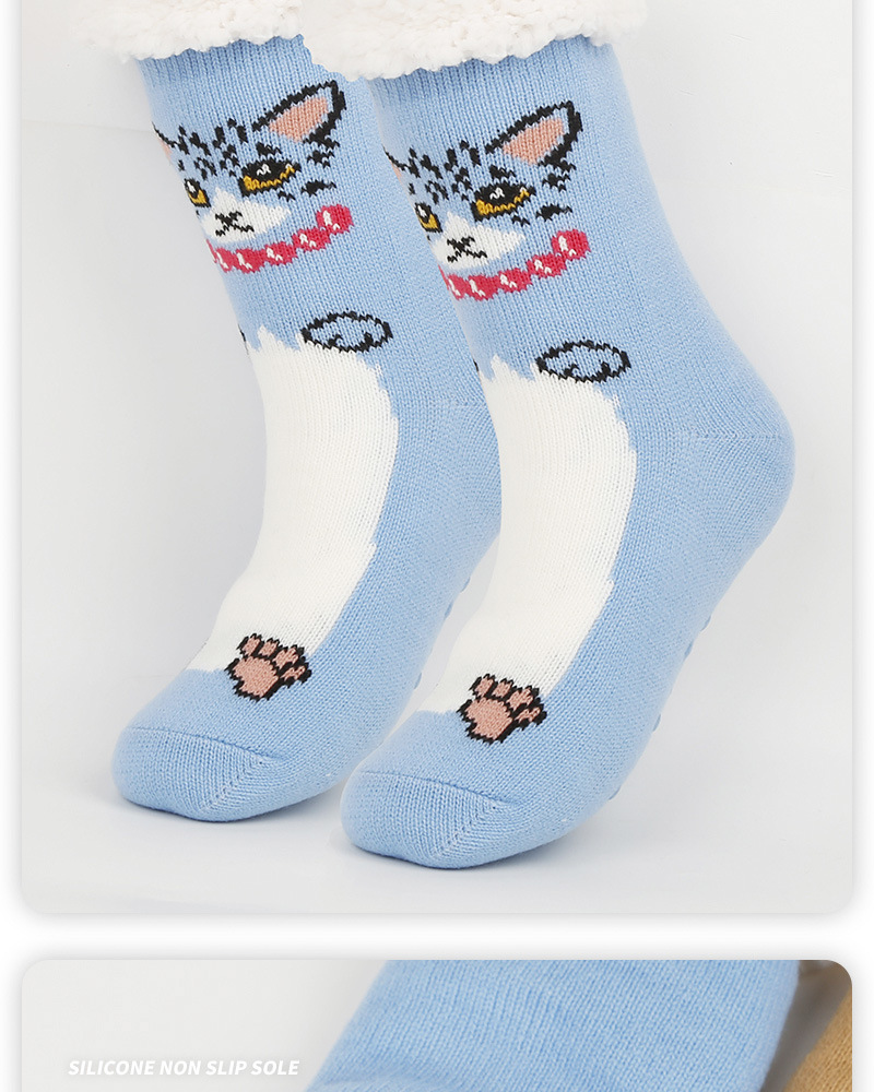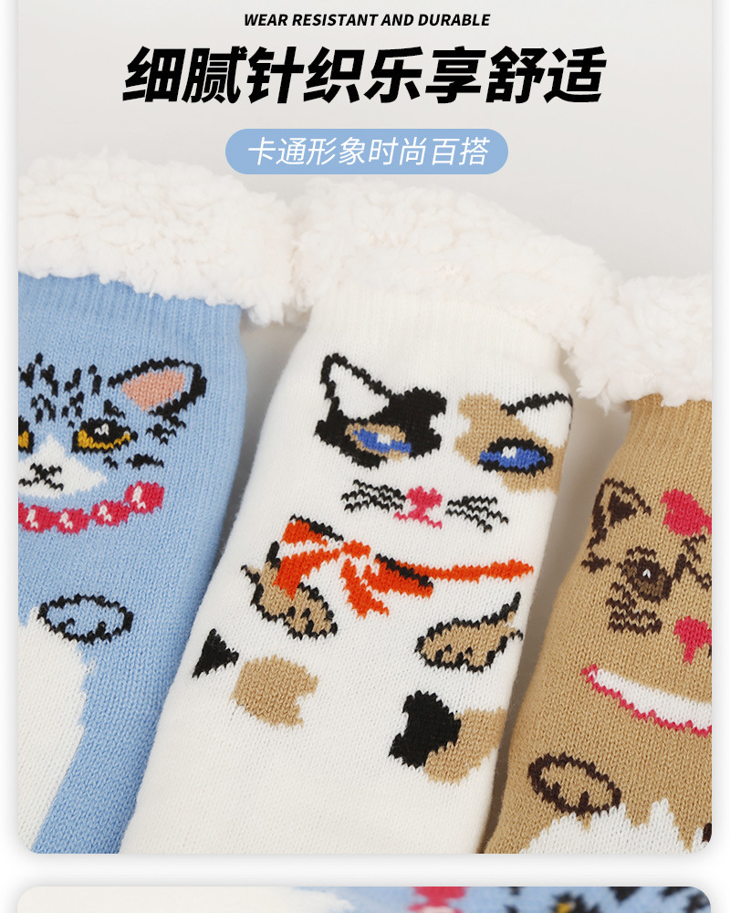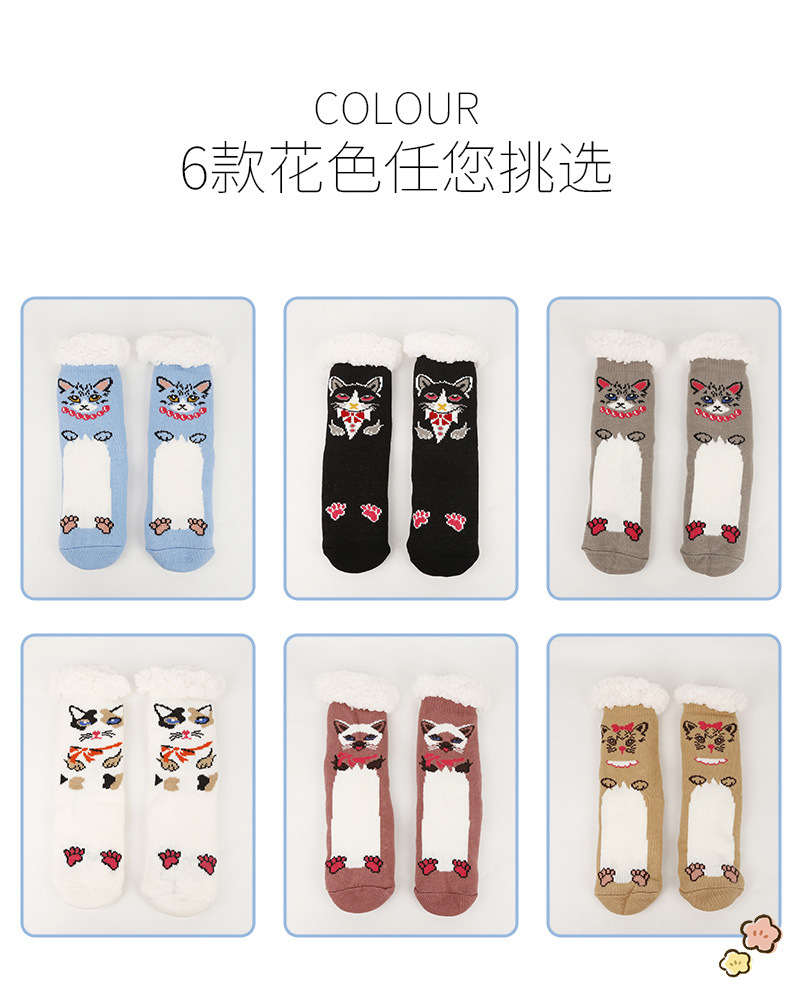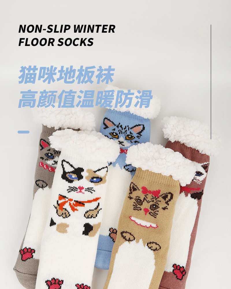 秋冬女士家居地板袜可爱猫咪图案成人加厚保暖防滑底室内袜套