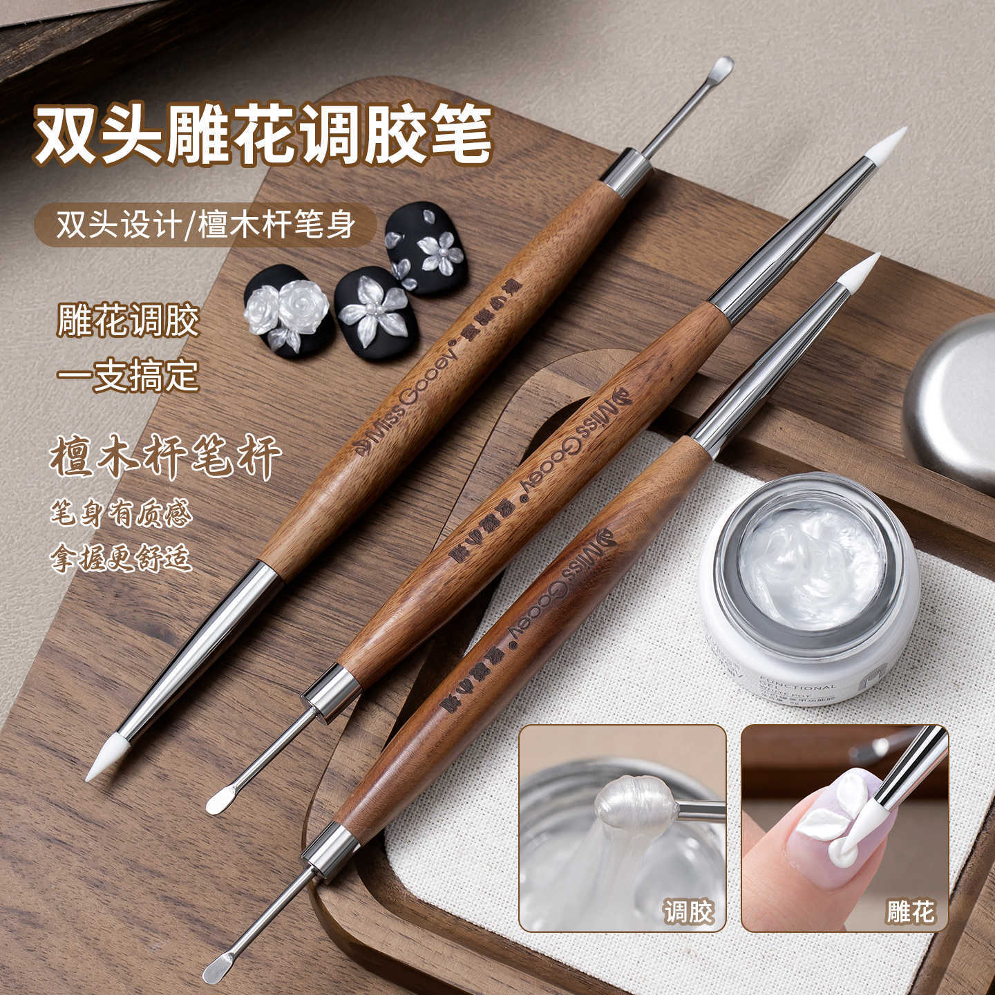 双头雕花调胶笔美甲工具檀木杆穿戴甲手绘笔压花彩绘涂蹭魔镜粉