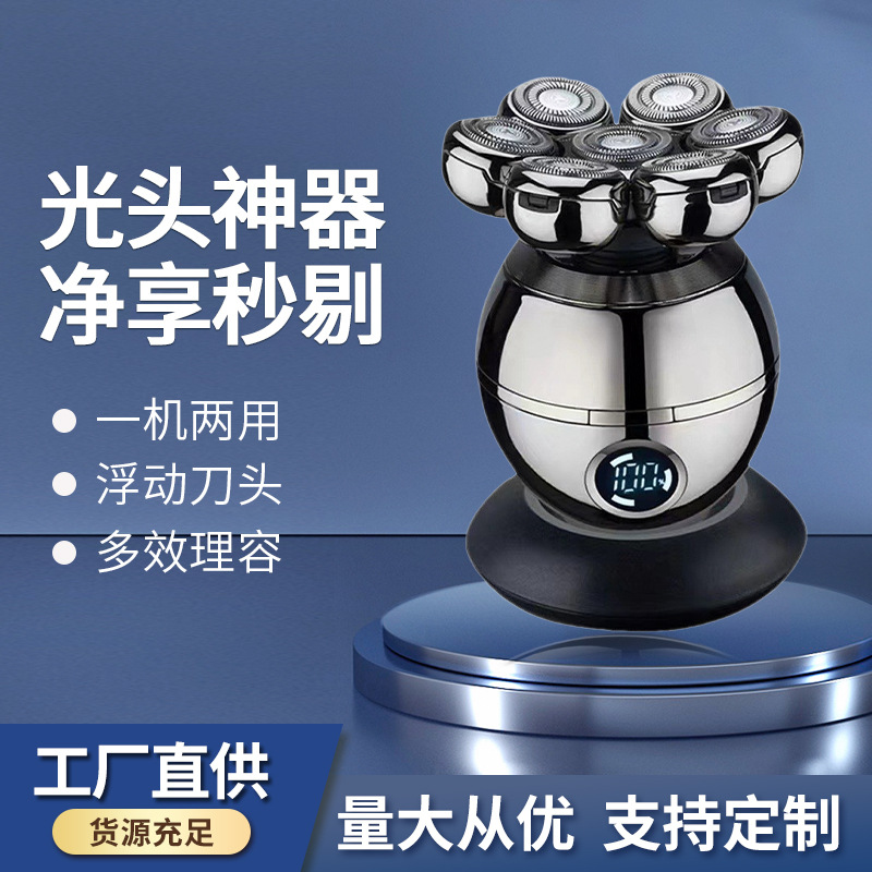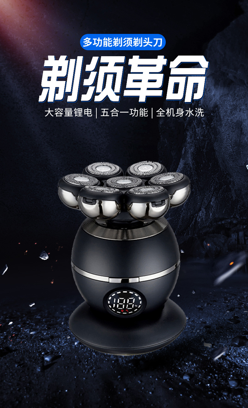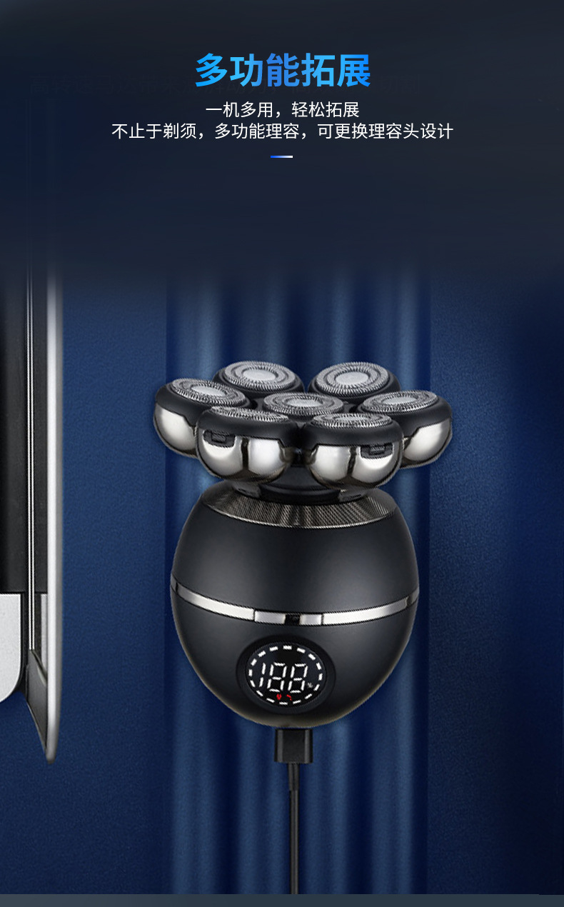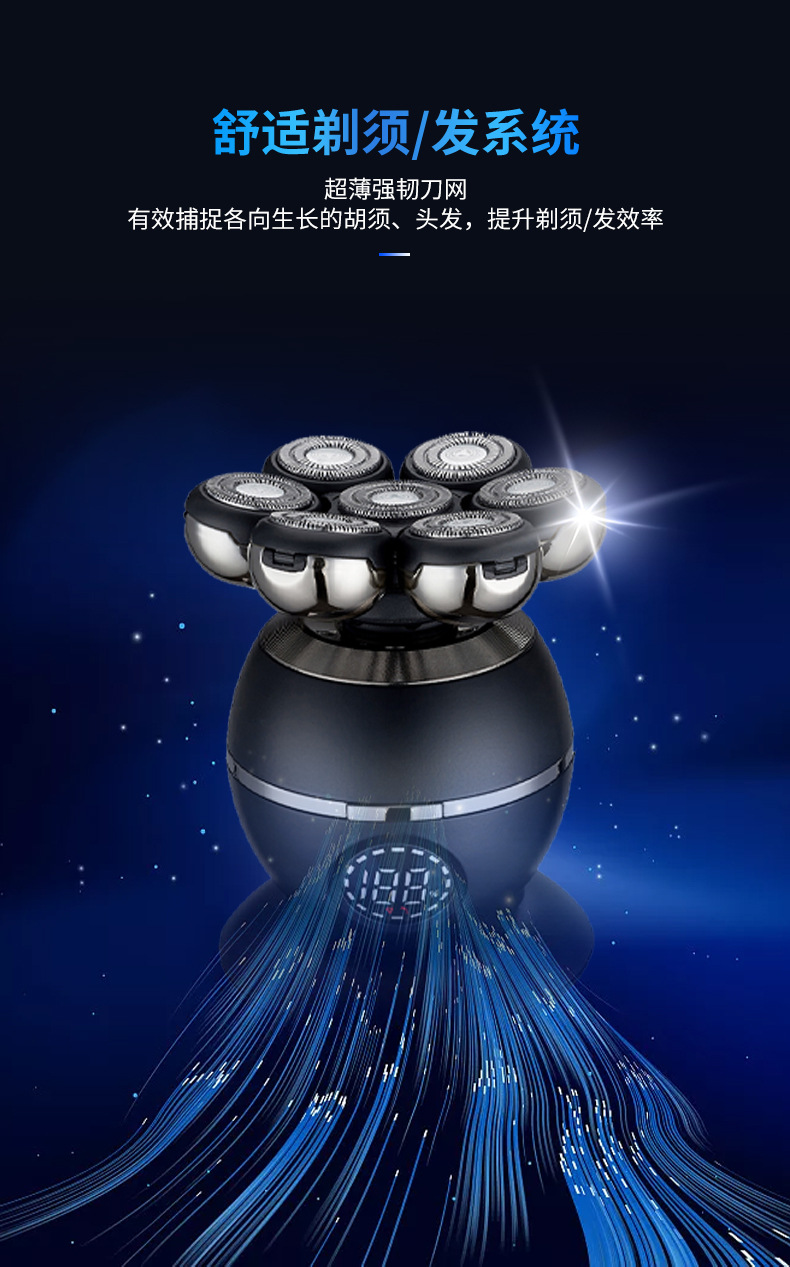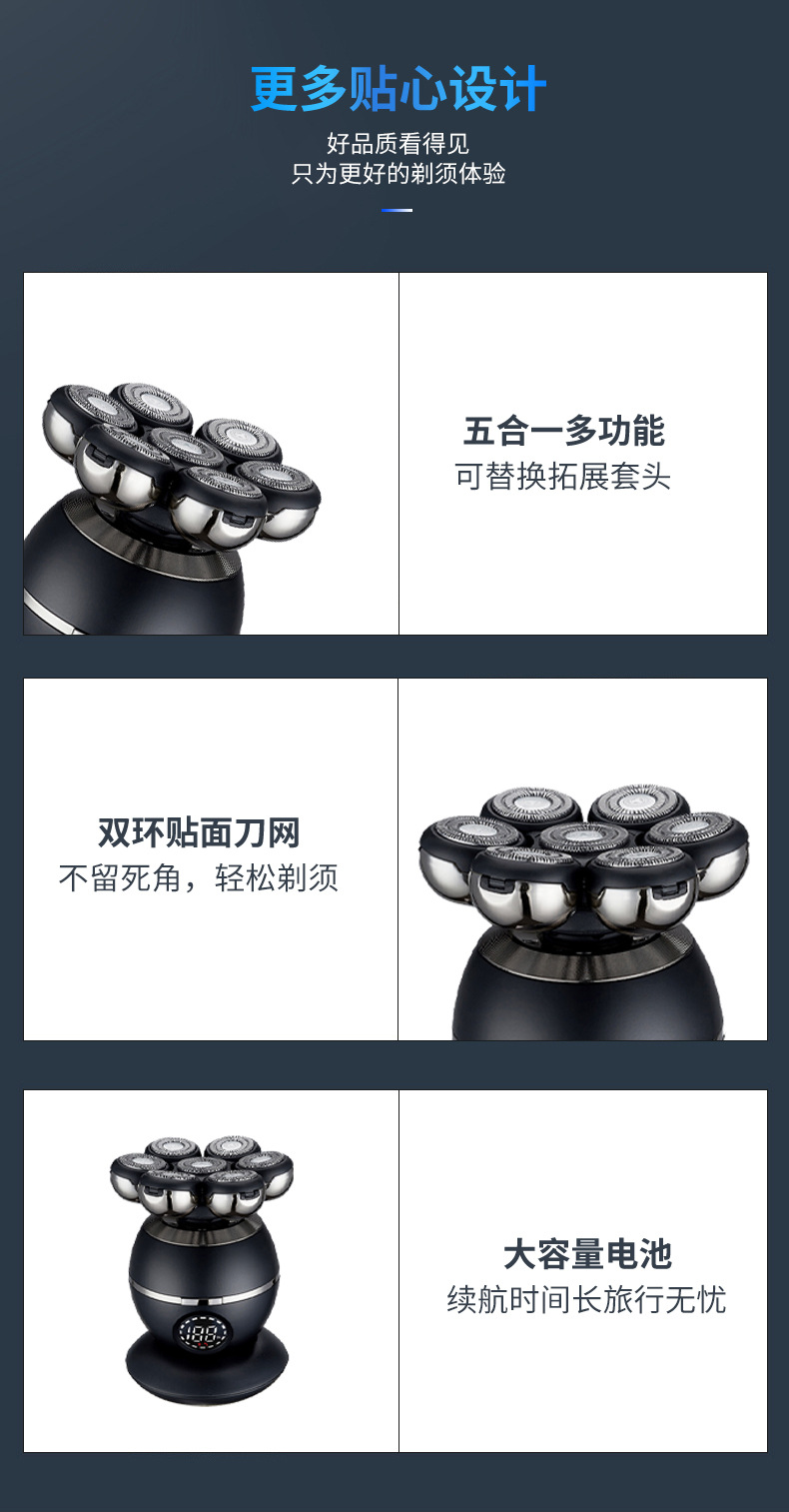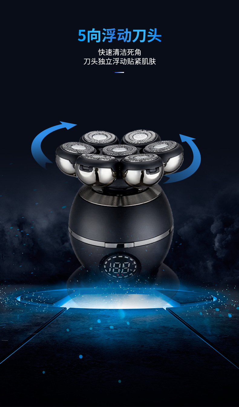 2,旋转式7D刀头双环刀片,立体刀头结构。3,升级锂电池,快速充电,电量持久耐用,持续使用50分钟以上,2小时快充,充电,使用电量数字显示
