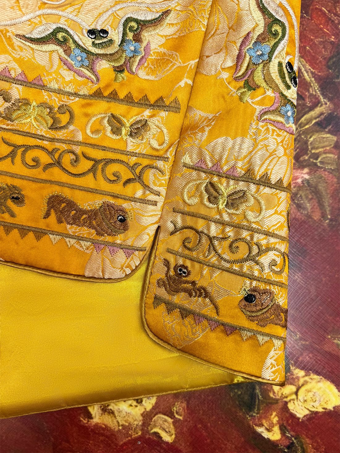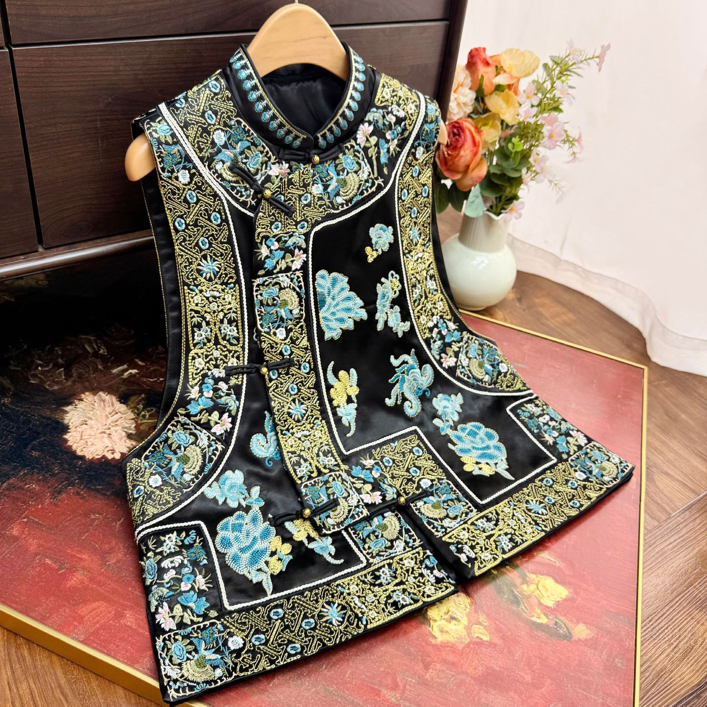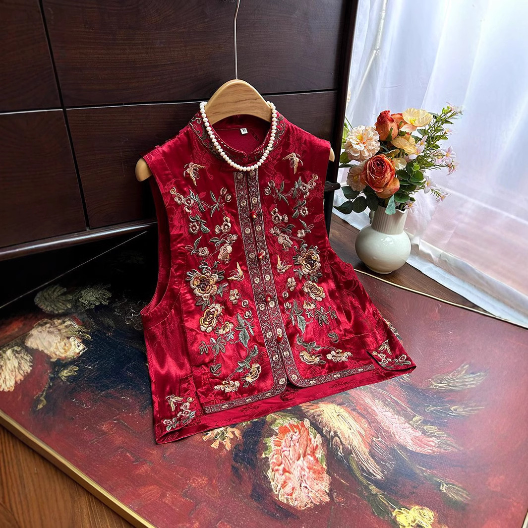 2025春の新作サテン再加工刺繍ノースリーブ小カン肩民族風レトロ気質立襟ショートベスト