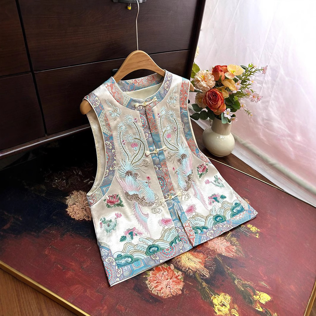 新中国式鳳凰格馬甲女2025年春新作民族風盤バックル優雅刺繍カン肩馬挟み