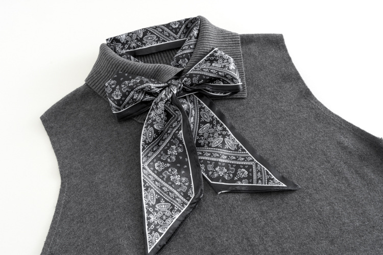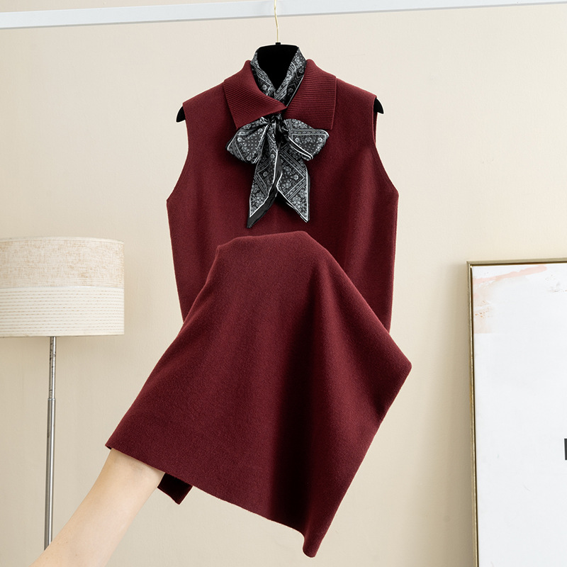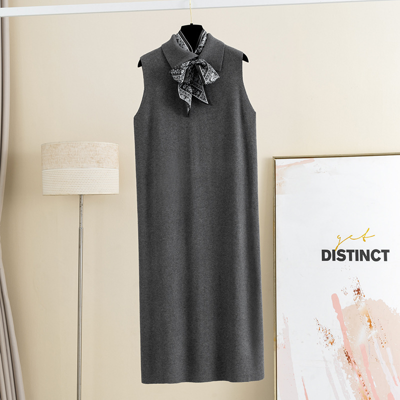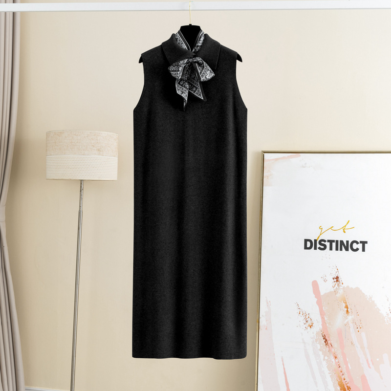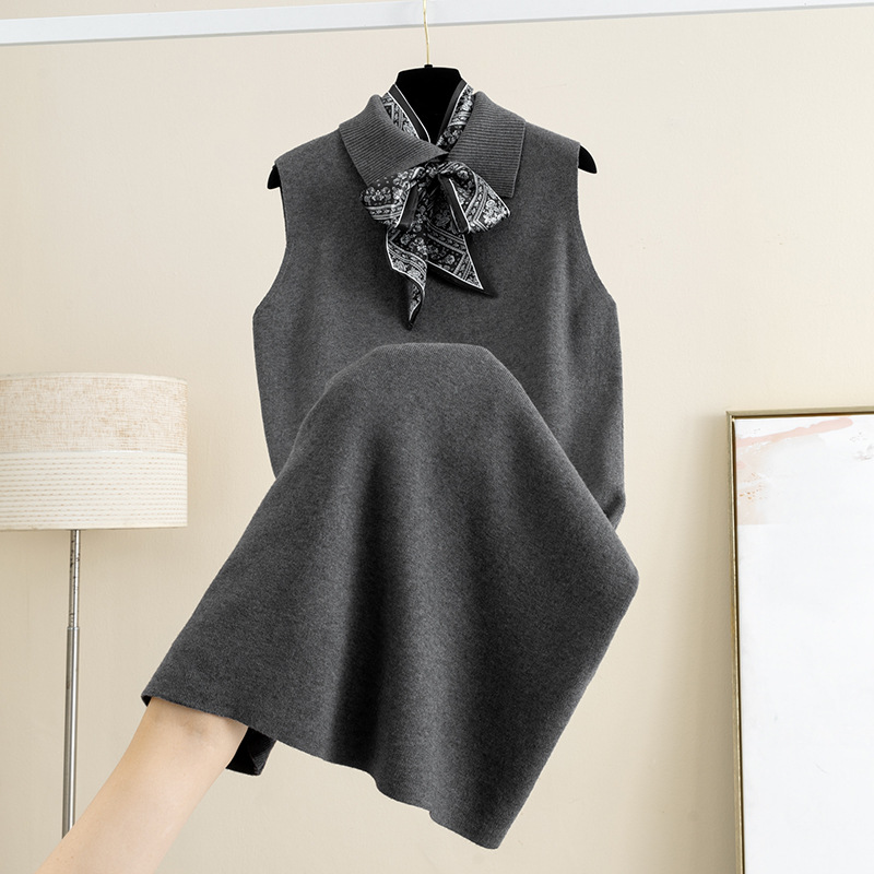 羊毛翻领配丝巾针织背心连衣裙女秋冬新款宽松显瘦外穿内搭毛衣裙