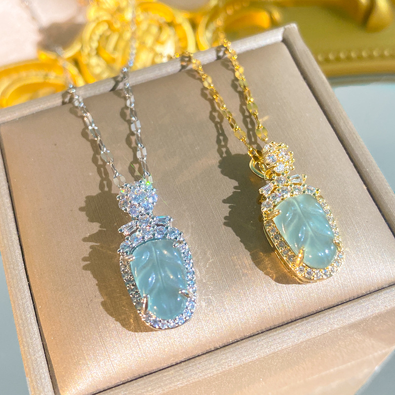 新品精致仿玉髓冰种翡翠叶子钛钢项链女镶嵌满钻锆石湖蓝色锁骨链
