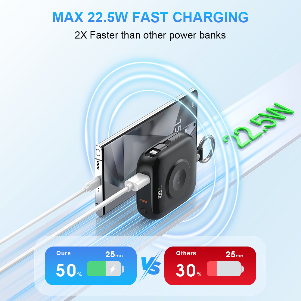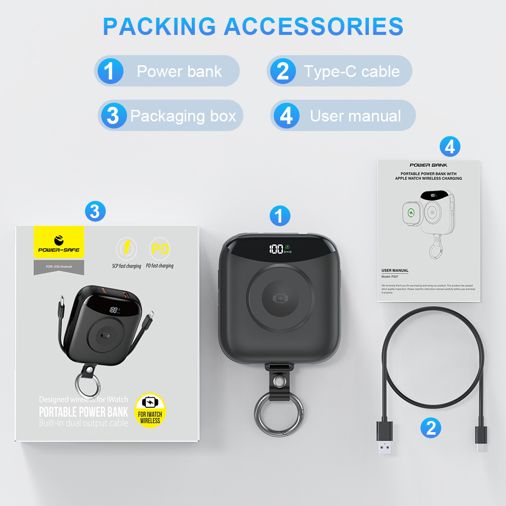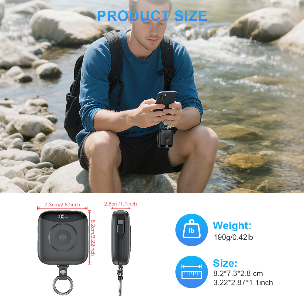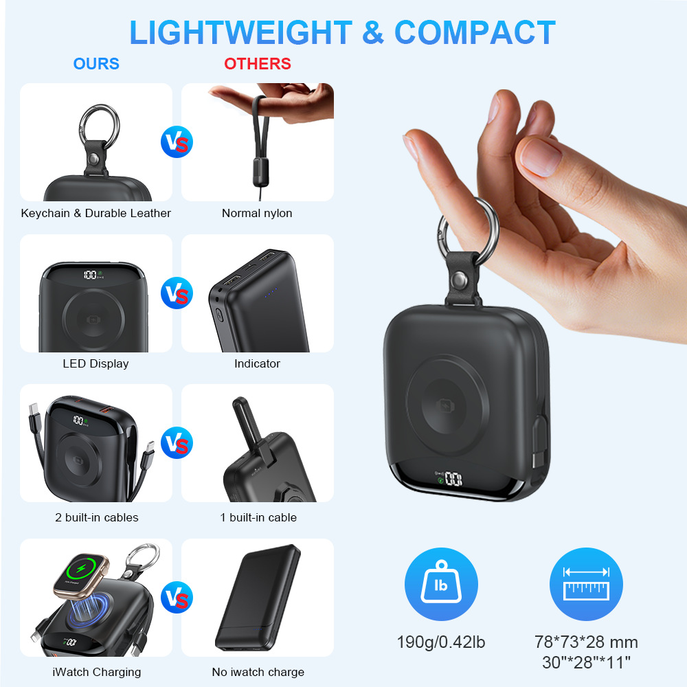 【产品特点】:便携自带线;锌合金吊环,LED数显,苹果手表无线充