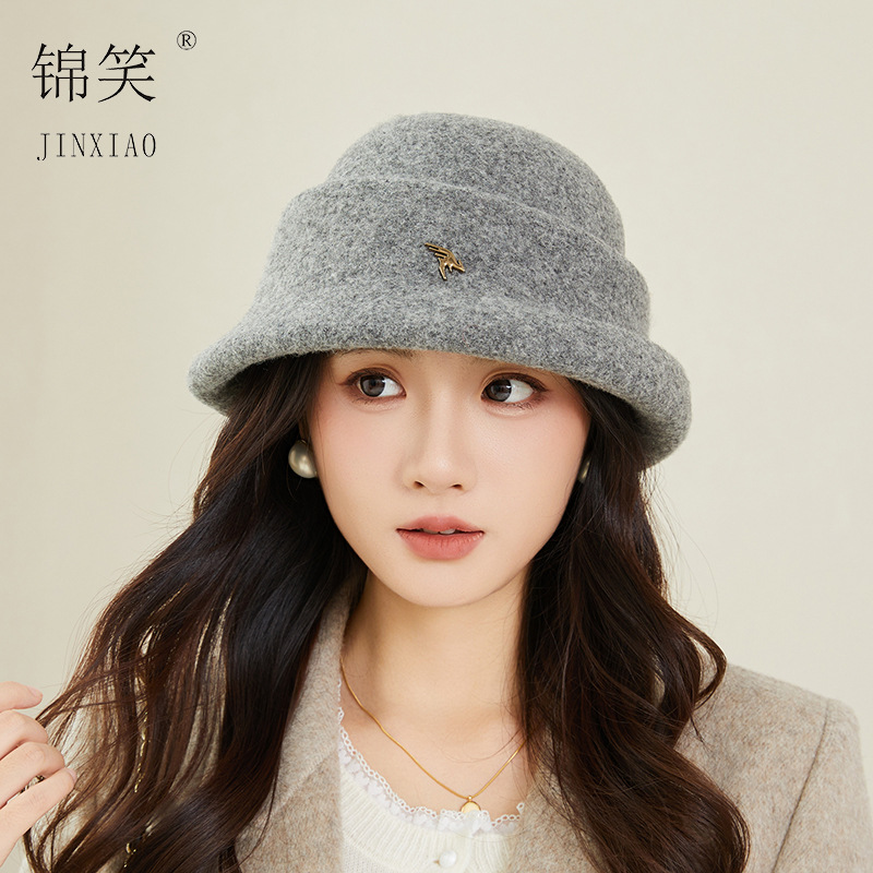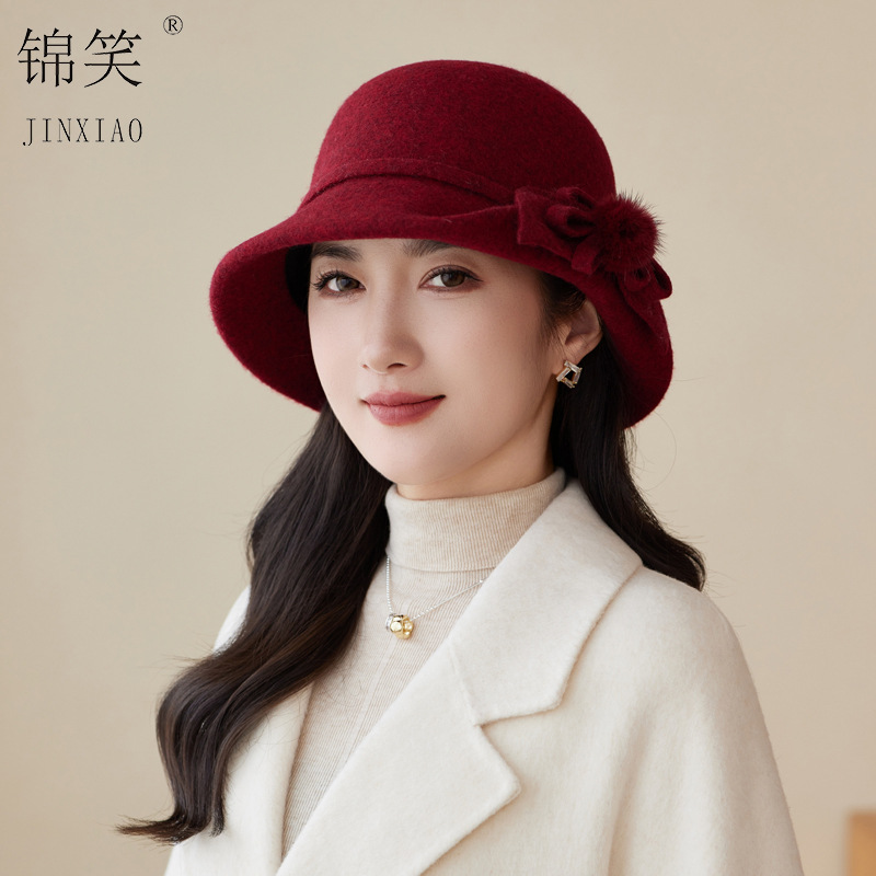 新款羊毛呢渔夫帽女秋冬保暖优雅气质盆帽高级感时尚百搭花朵礼帽