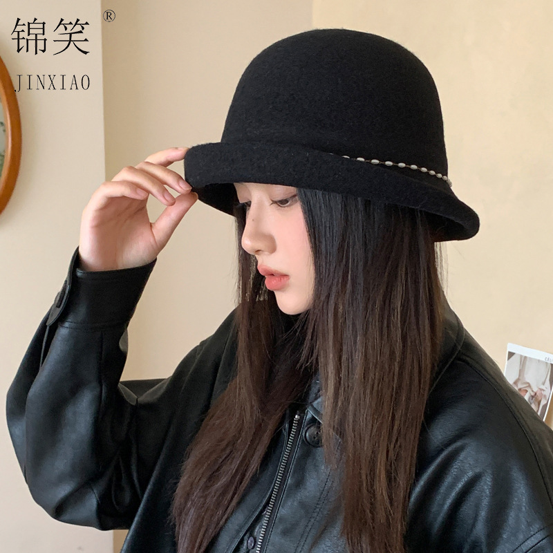 秋冬气质名媛渔夫帽新款日系赫本风羊毛呢盆帽百搭时尚蝴蝶结礼帽