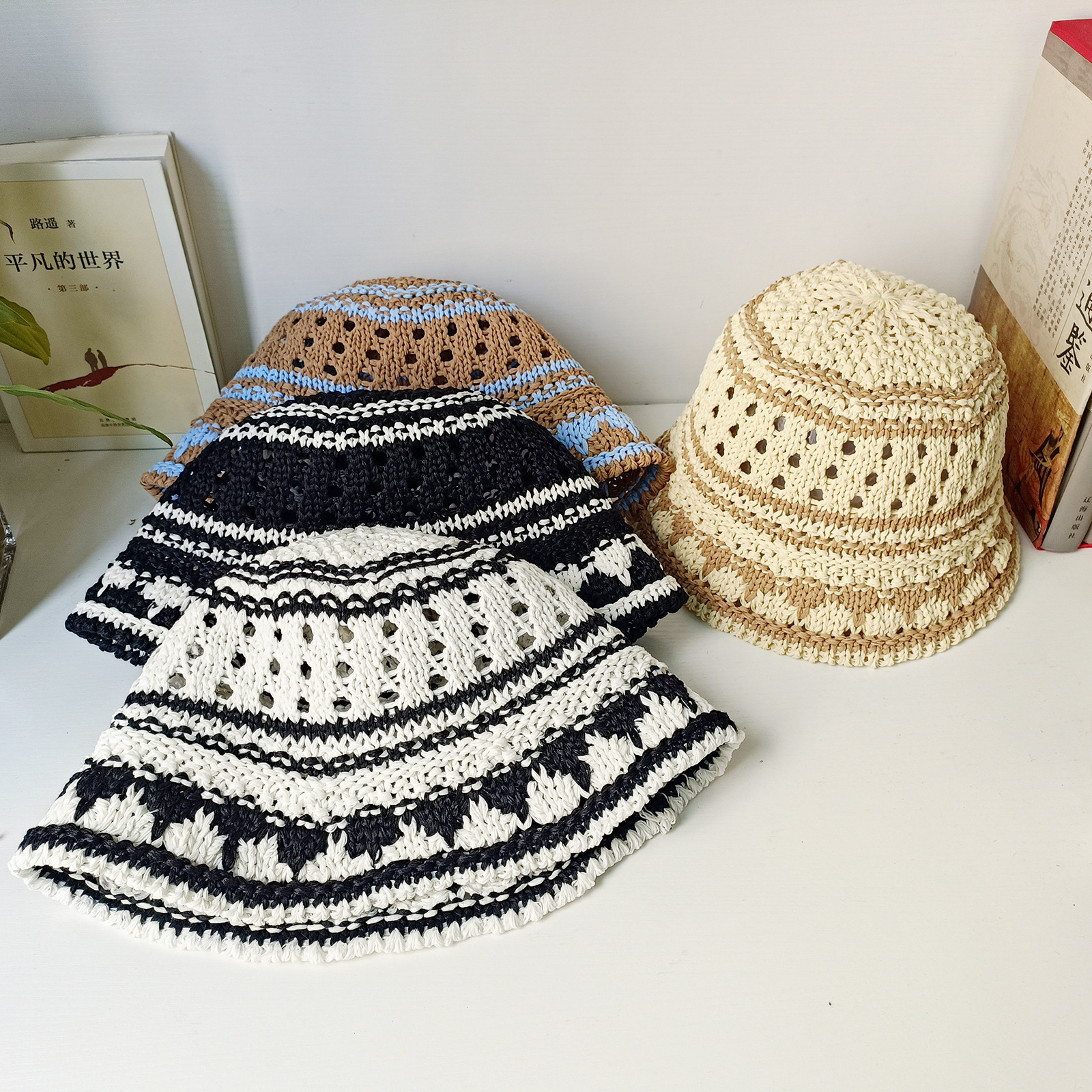 韓国スタイルのコントラストパターン中空漁師帽子女性のための夏の日焼け止め通気性ニット帽子屋外旅行無地バケットハット