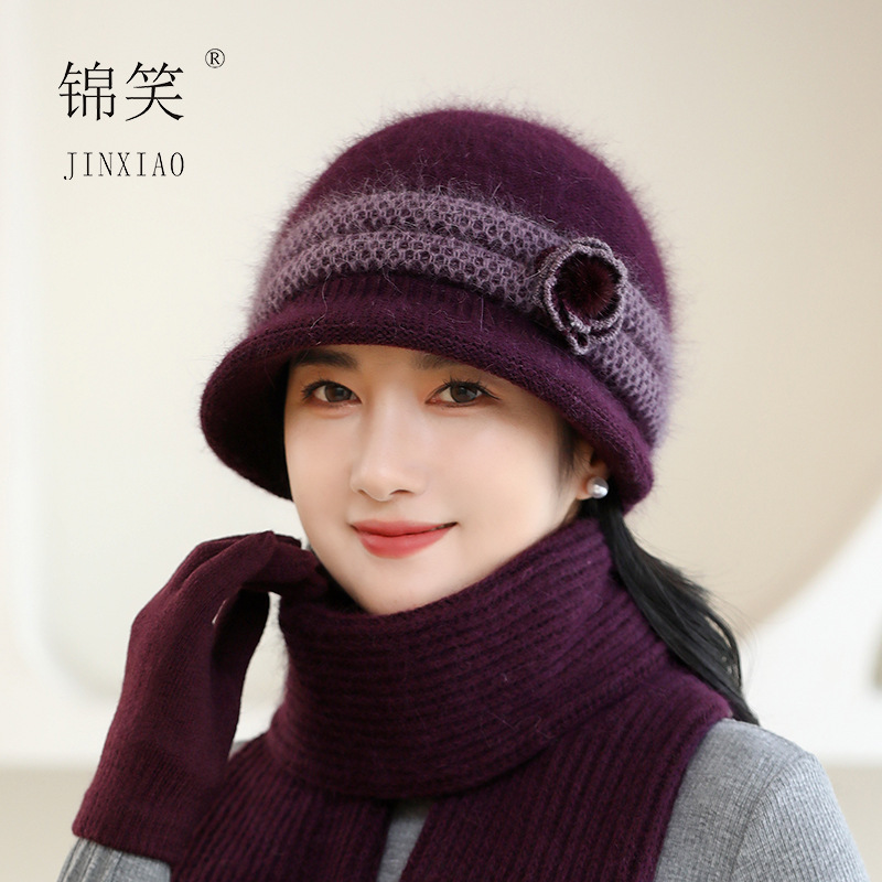 中高年のベルベット保温盆帽冬の女性ニット防寒ウサギの毛帽子ファッションは色の花のお母さんの帽子にぶつかった