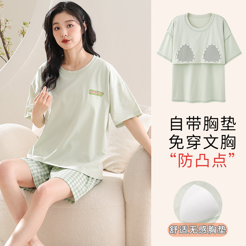 胸パッド付きパジャマ女性夏の薄いタイプの氷の涼しさの半袖の半ズボンは大きいサイズのモーダルの家の服のスーツを着ることができます。