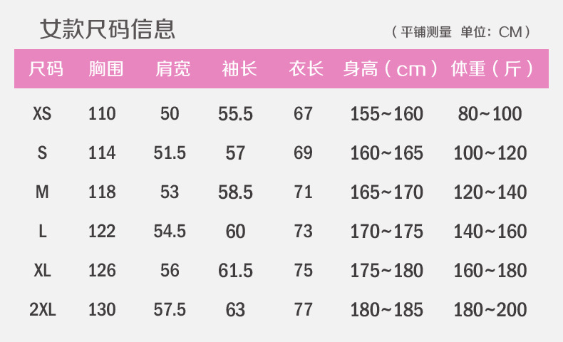 男款S【100-120】,男款M【110-130】,男款L【130-150】,男款XL【150-170】,男款2XL【170-190】,男款3XL【190-210】,男款4XL【210-230】,女款XS【80-100】,女款S【100-120】,女款M【120-140】,女款L【140-160】,女款XL【160-180】,女款2XL【180-200】