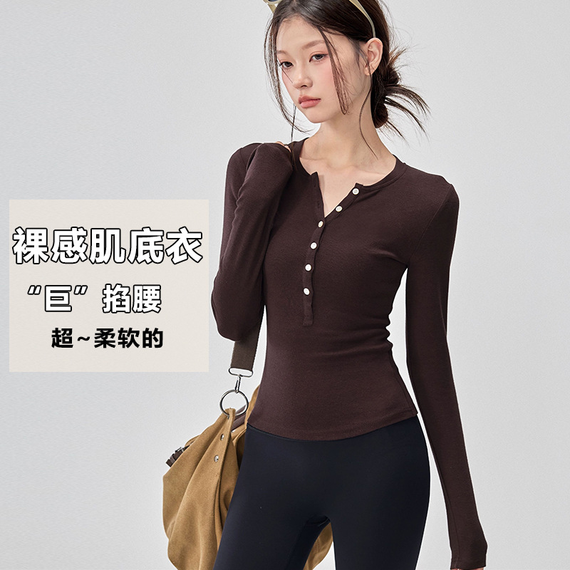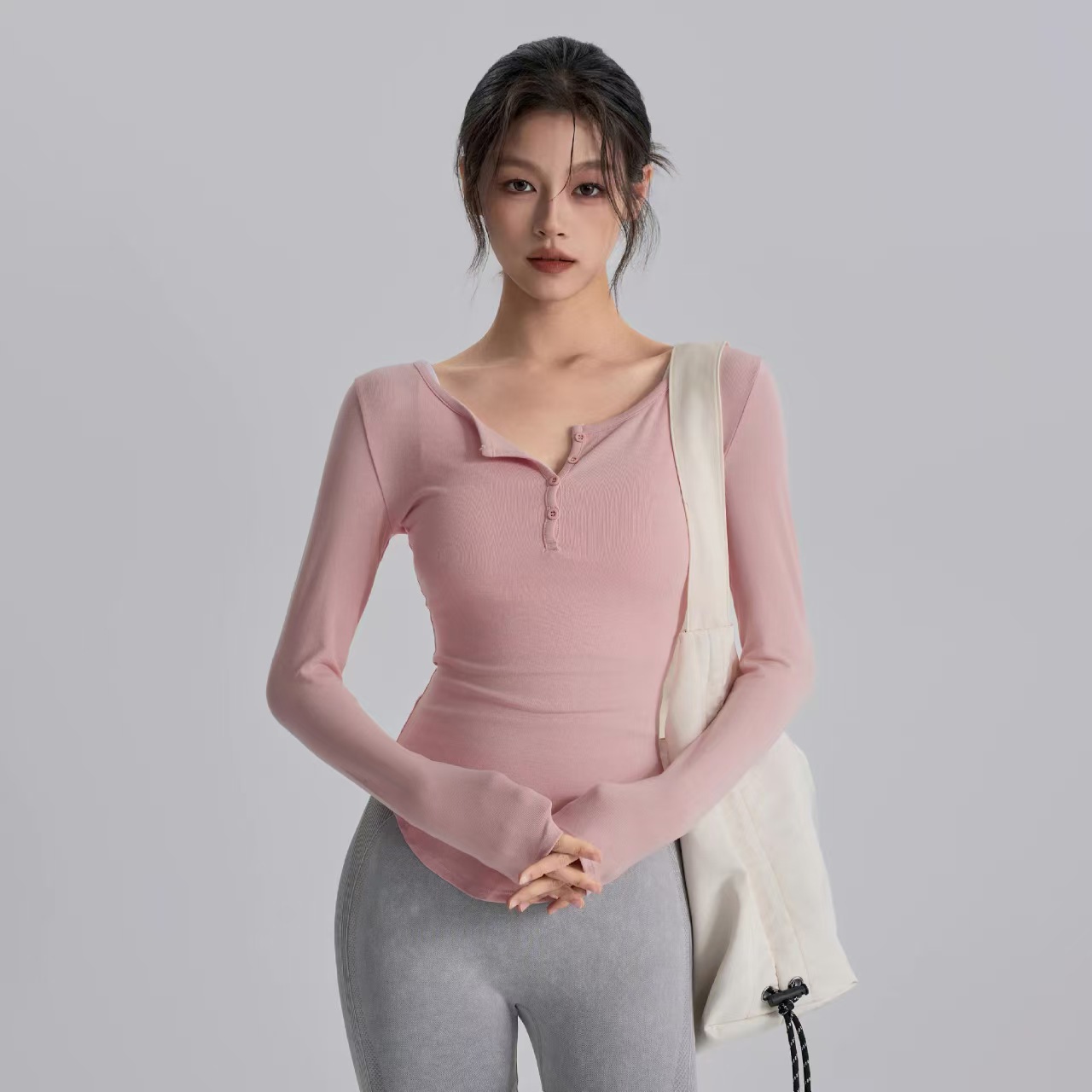 新款瑜伽服女长袖亨利领贝壳扣运动上衣打底培拉提训练健身服女