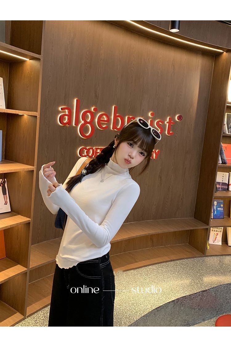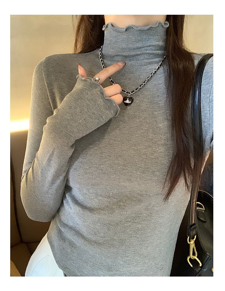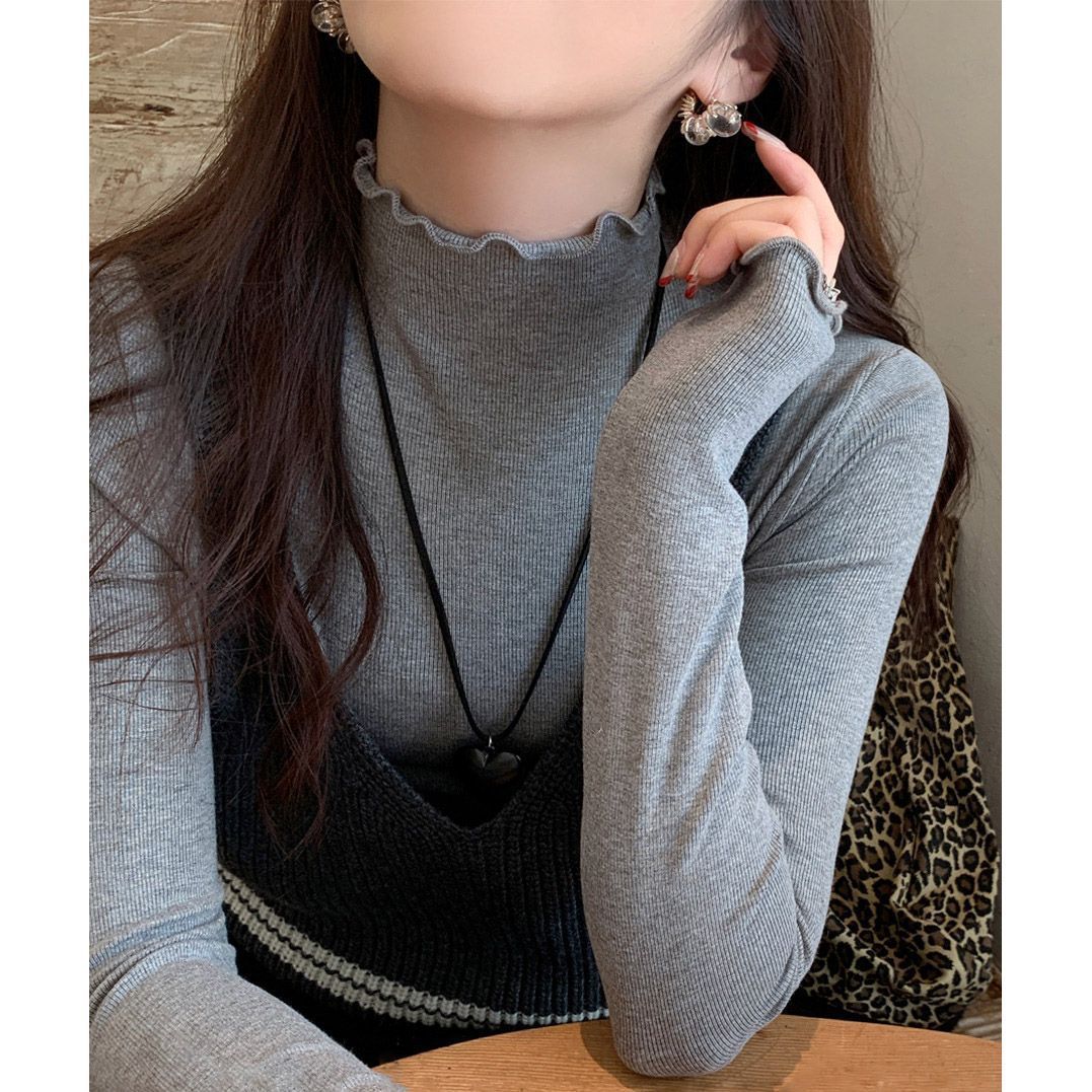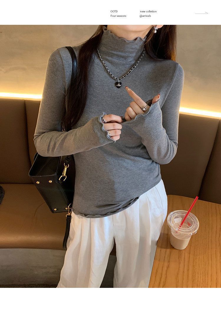 深灰色木耳花边半高领磨毛打底衫女士内搭秋冬高级感中领上衣